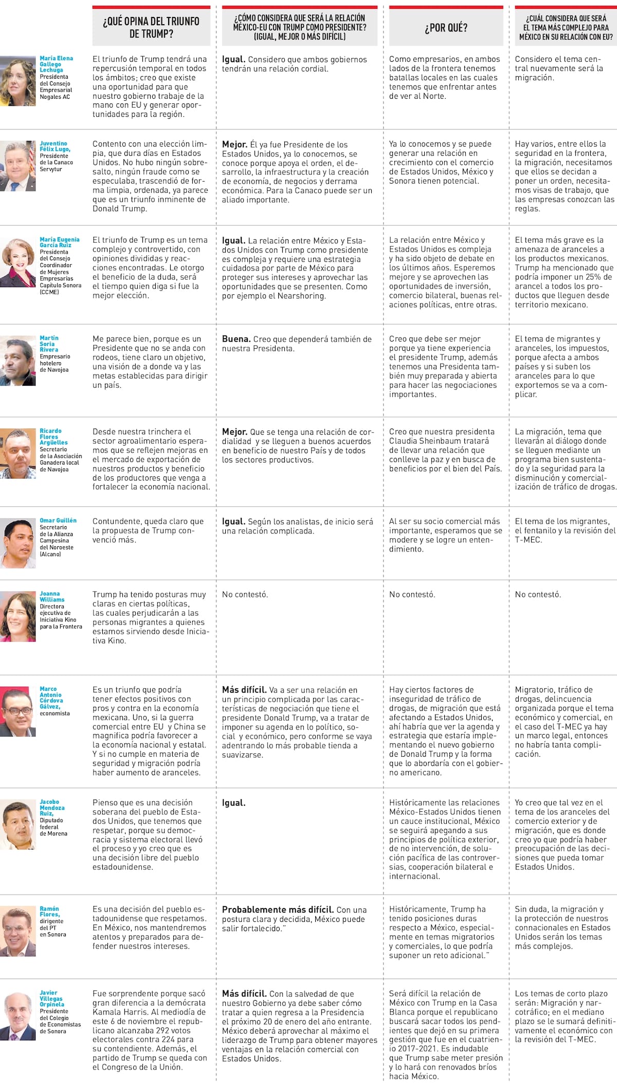 HERMOSILLO, Sonora.- Representantes de sectores productivos, empresariales, académicos y editorialistas expresaron opiniones diversas sobre el triunfo del candidato republicano a la Presidencia de EU, aunque hubo coincidencias en que de los temas complejos que tendrá México serán el de migración y tráfico de drogas.
