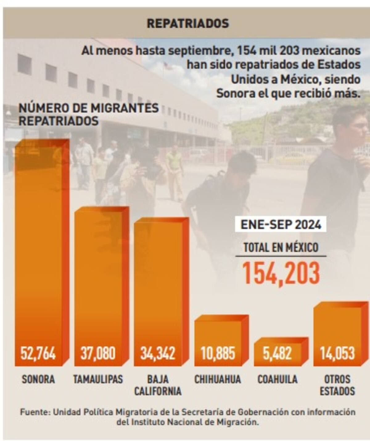 Sonora se posicionó en el primer lugar a nivel nacional por ser la frontera con Estados Unidos que más mexicanos ha recibido del vecino país en el periodo de enero a septiembre del 2024, al abarcar el 37.4% del total.