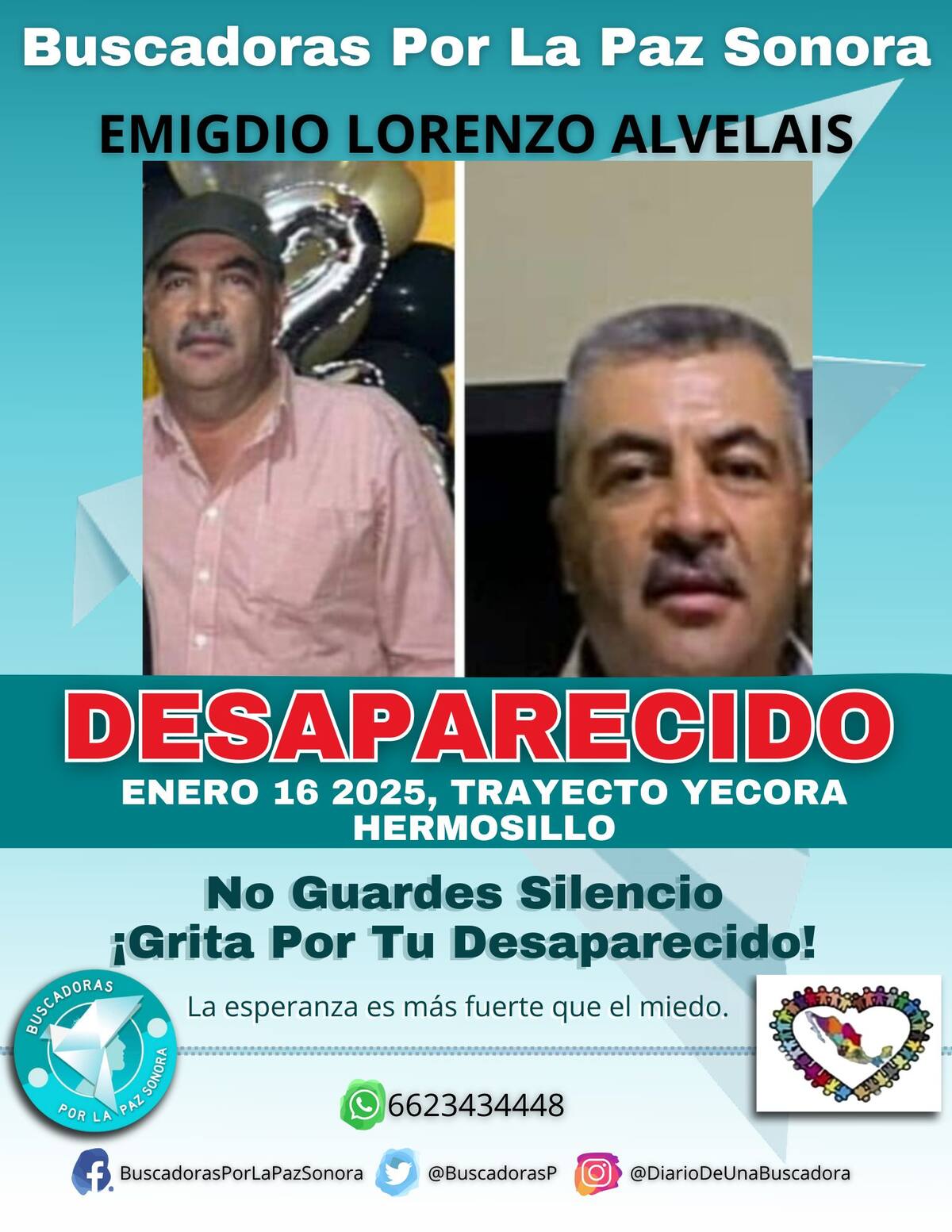 CIUDAD OBREGÓN, Sonora.- La Comisión de Búsqueda de Personas Desaparecidas del Estado de Sonora solicita el apoyo para localizar a Emigdio Lorenzo Alvelais Rodríguez, luego de que fue visto por última vez el pasado 16 de enero en la carretera de Yécora a Hermosillo.