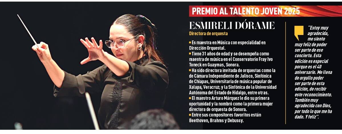 En ese ánimo, el Premio al Talento Joven, que contemplaba únicamente a músicos y cantantes, se entregará este año a la directora de orquesta hermosillense Esmireli Dórame.
