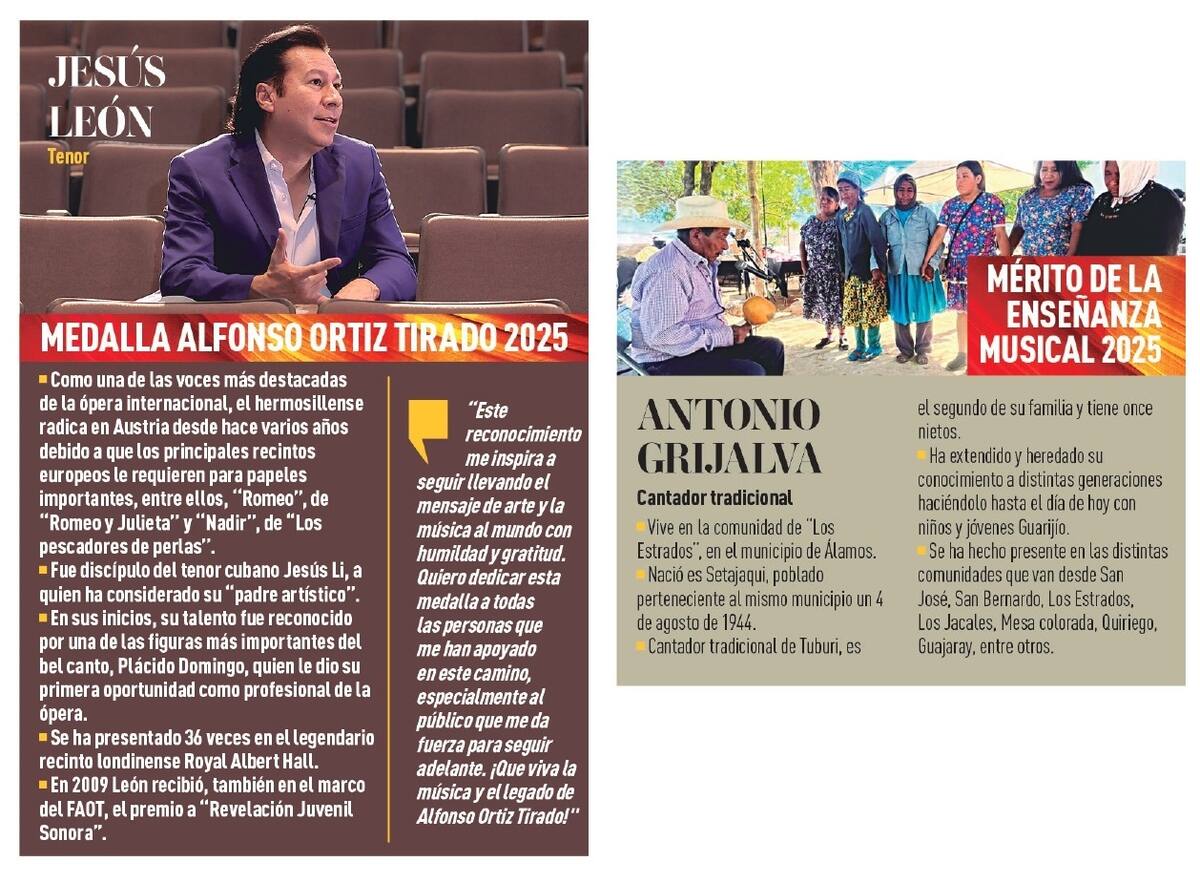 La Medalla Alfonso Ortiz Tirado, galardón de los más relevantes en todo el País, se entregó por primera vez en 2004; en aquel año, se le otorgó al tenor cajemense Alfonso Navarrete. En esta edición número 40, el ganador es otro tenor sonorense: Jesús León.