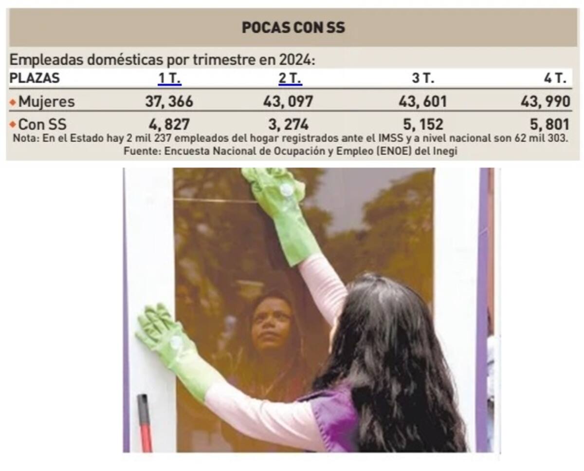 De los 50 mil 694 trabajadores domésticos remunerados que tuvo el Estado en el periodo de octubre a diciembre, 43 mil 990 fueron mujeres, y de ellas sólo 5 mil 801 contaron con seguridad social.