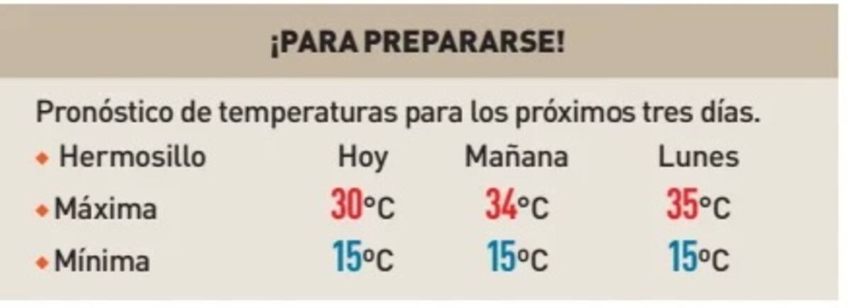 Hermosillo podría alcanzar los 34ºC mañana, de acuerdo al pronóstico de la Conagua Sonora, con base en los datos publicados por el Servicio Meteorológico Nacional (SMN) y se esperan valores similares en el termómetro para inicios de la próxima semana.