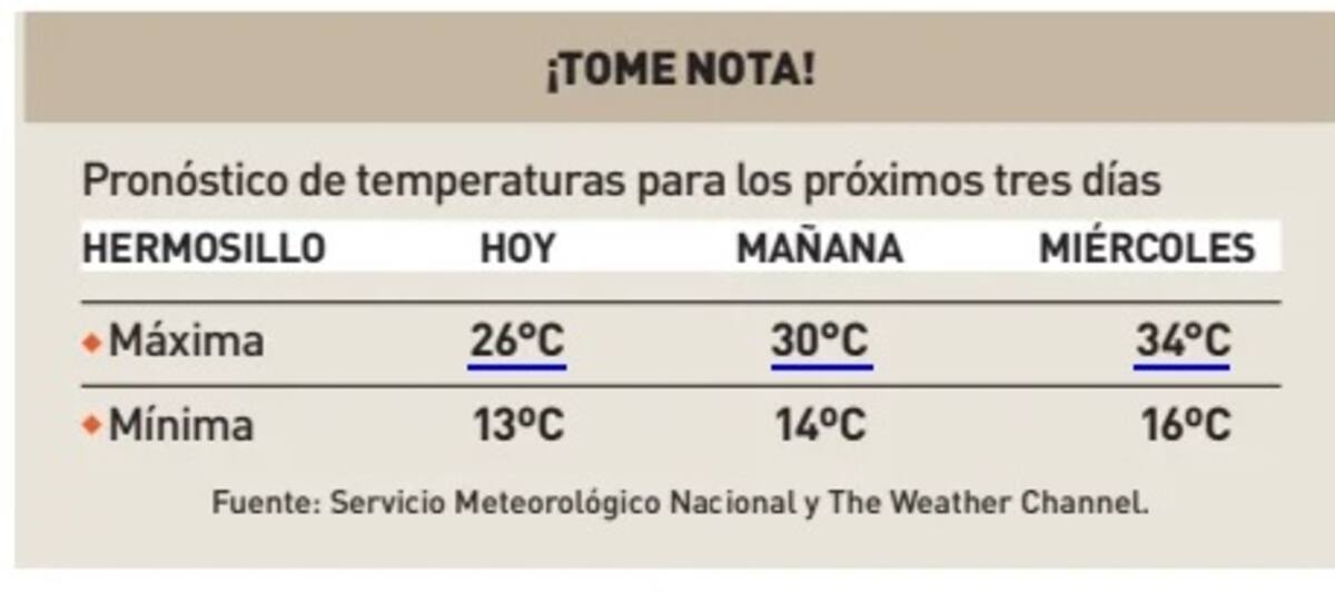 De acuerdo al pronóstico del SMN y The Weather Channel, el ambiente en la mayor parte del Estado seguirá siendo agradable, con temperaturas por debajo de los 30ºC en localidades del Centro y Sur de Sonora, incluyendo Hermosillo.