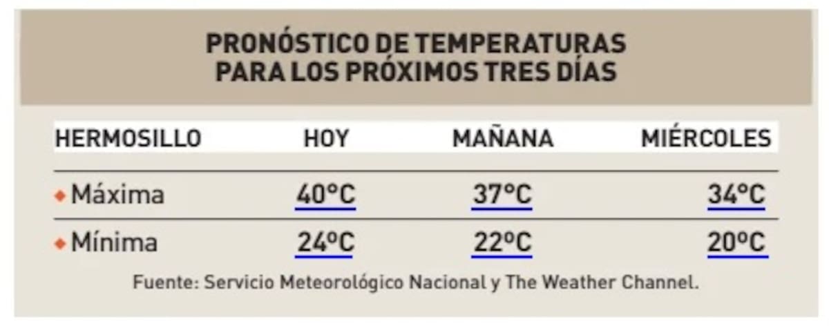 De acuerdo al pronóstico del Servicio Meteorológico Nacional, las altas temperaturas seguirán afectando al Estado durante este inicio de semana, pues para hoy se esperan valores máximos de entre 40ºC y 45ºC en localidades del Centro, Noroeste y Sur de Sonora.
