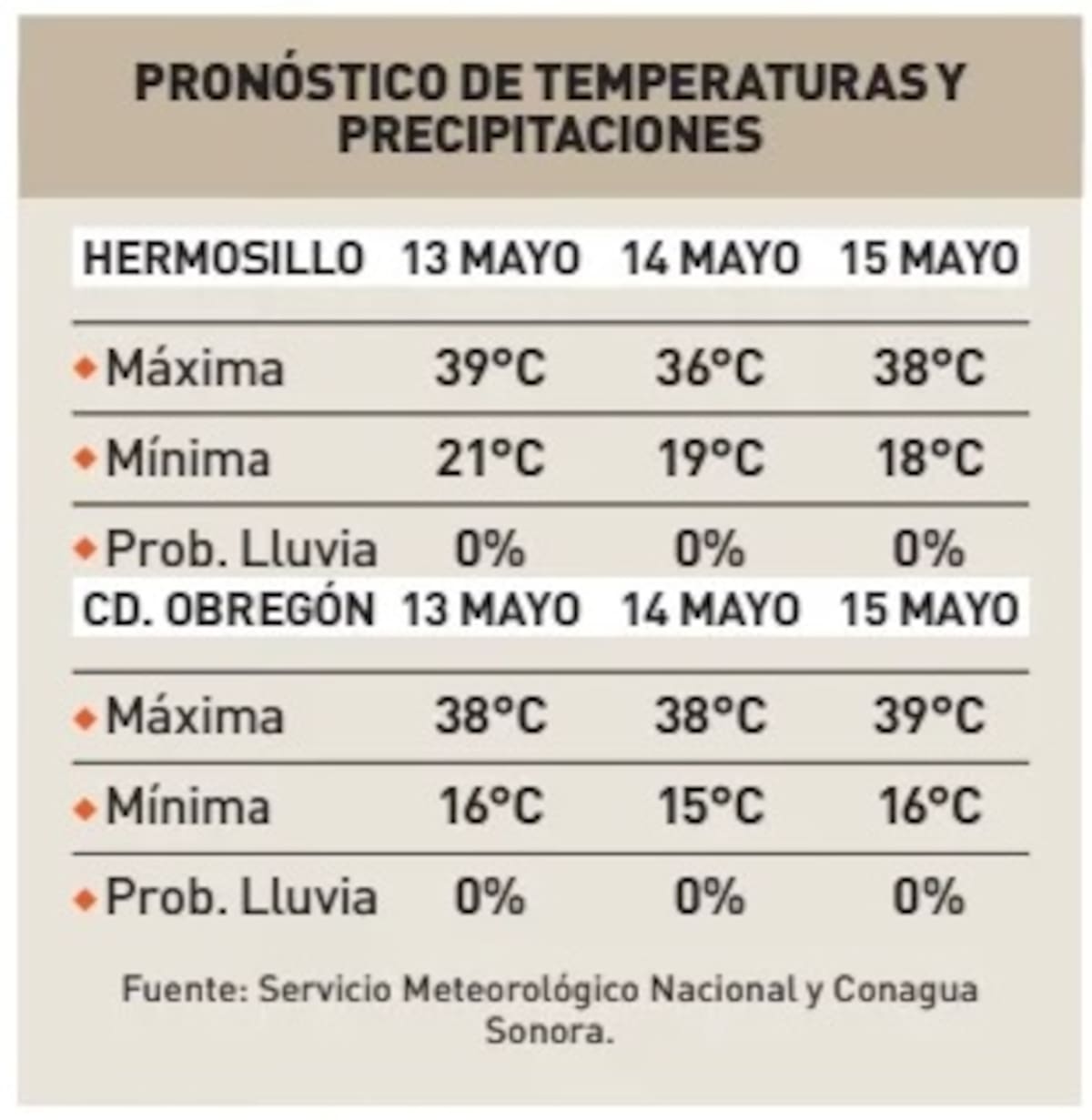 Hermosillo amaneció ayer con una temperatura mínima de 21°C, con una humedad relativa del 35% y registró una máxima de 42°C, con algunos vientos de hasta 50 km/h.