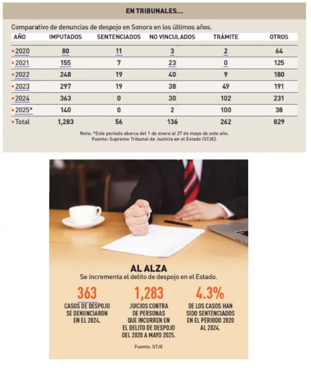 HERMOSILLO, Sonora.- Aunque de uno a seis años es la sanción por despojo, ya sea por ocupar bienes inmuebles, derechos reales, de agua, entre otros, este delito sigue aumentando y la cifra de casos con sentencia en los últimos cuatros años es mínima.