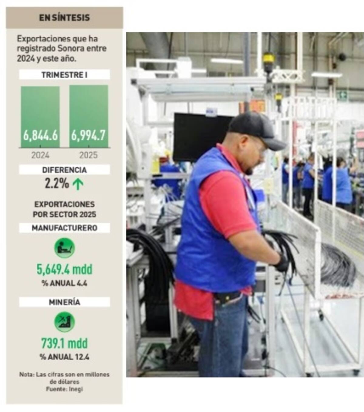 HERMOSILLO, Sonora.- En el primer trimestre del 2025 Sonora exportó 6 mil 994.7 millones de dólares en diferentes productos, lo que representó un aumento anual del 2.2%.