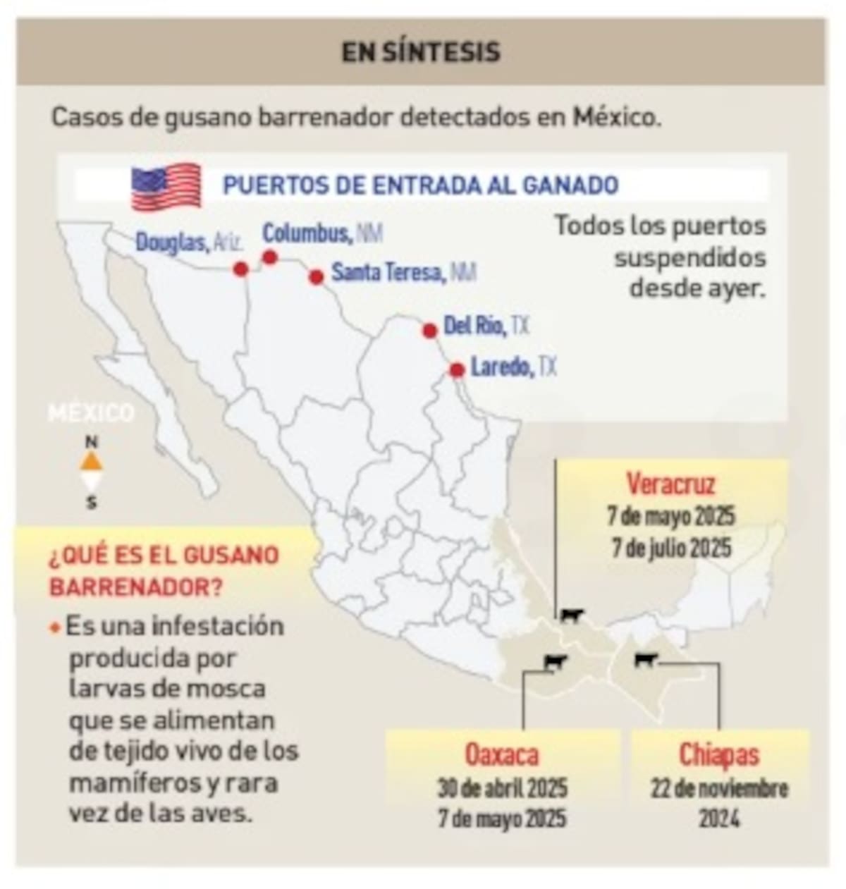 Estados Unidos suspendió la reapertura de garitas por un nuevo caso de gusano barrenador en Ixhuatlán de Madero, Veracruz.