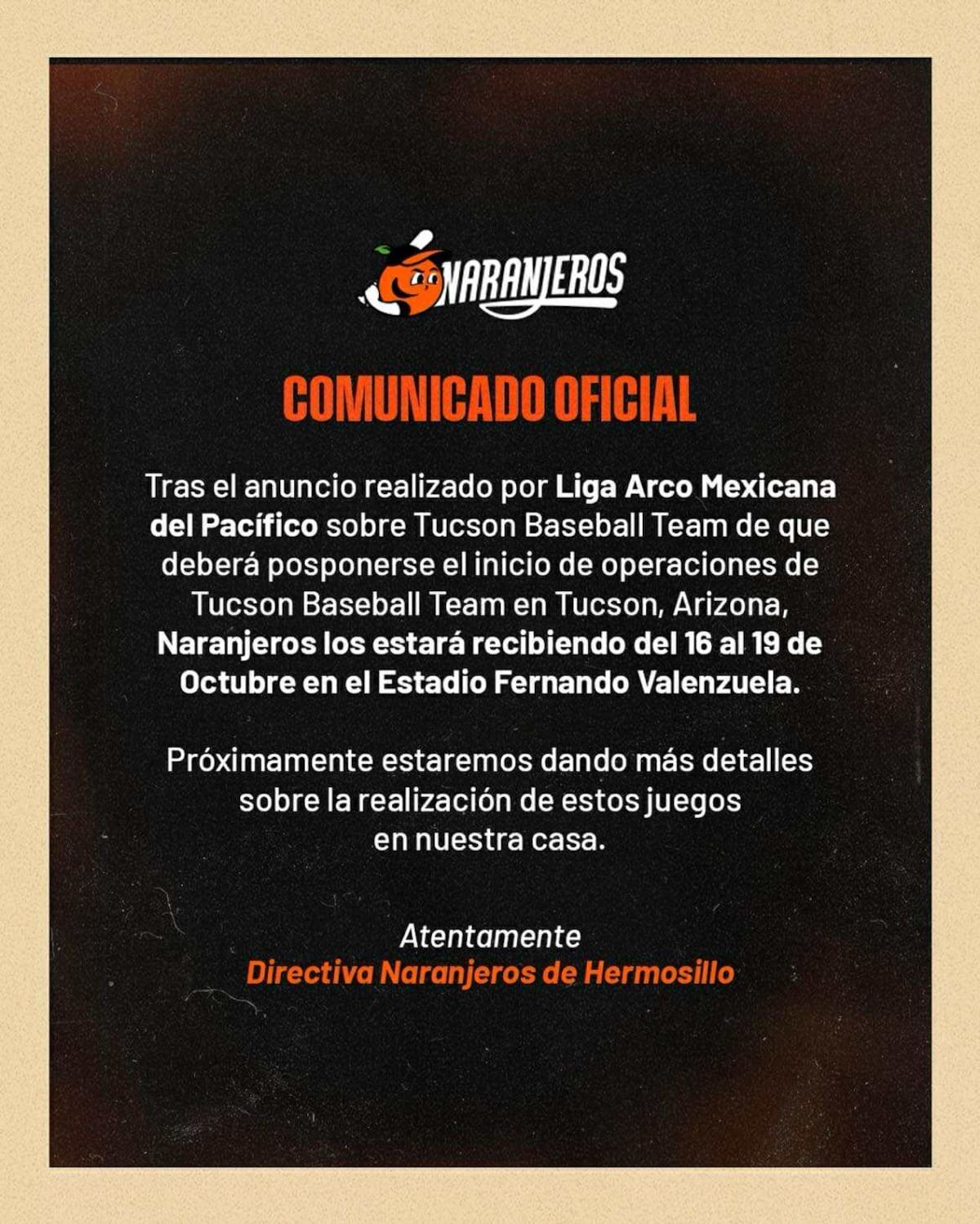 HERMOSILLO, Sonora.- — El Club Naranjeros confirmó esta tarde que, ante el anuncio de la Liga Mexicana del Pacífico (LMP) de que Tucson Baseball Team no podrá jugar como local hasta nuevo aviso, el equipo hermosillense recibirá a sus vecinos del Norte en los duelos del 16 al 19 de octubre, que estaban programados en el Veterans Memorial Stadium.