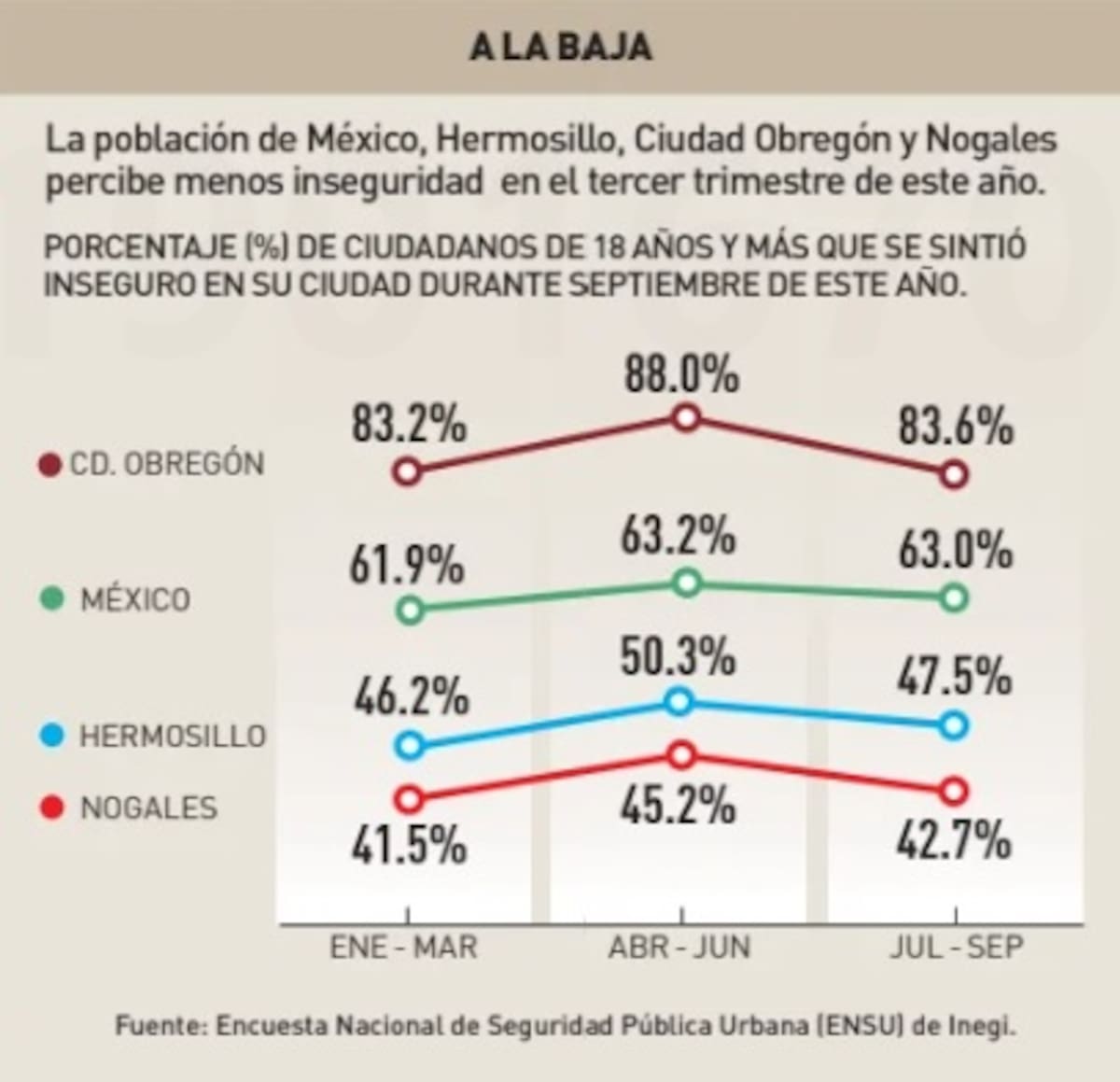 De acuerdo con esa encuesta aplicada ciudadanos de 18 años y más, el 50.3% de los hermosillenses percibieron inseguridad de vivir en su ciudad en junio, pero en septiembre se redujo a 47.5%, mientras que en Nogales también hubo una disminución al pasar de 45.2% en junio al 40% en septiembre.