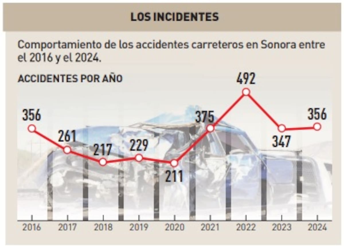 HERMOSILLO, Sonora.- Los accidentes en carreteras federales de Sonora y el número de víctimas fatales por este concepto se incrementaron en 2024 en relación al año anterior, revelan las últimas cifras de la Secretaría de Infraestructura, Comunicaciones y Transportes.