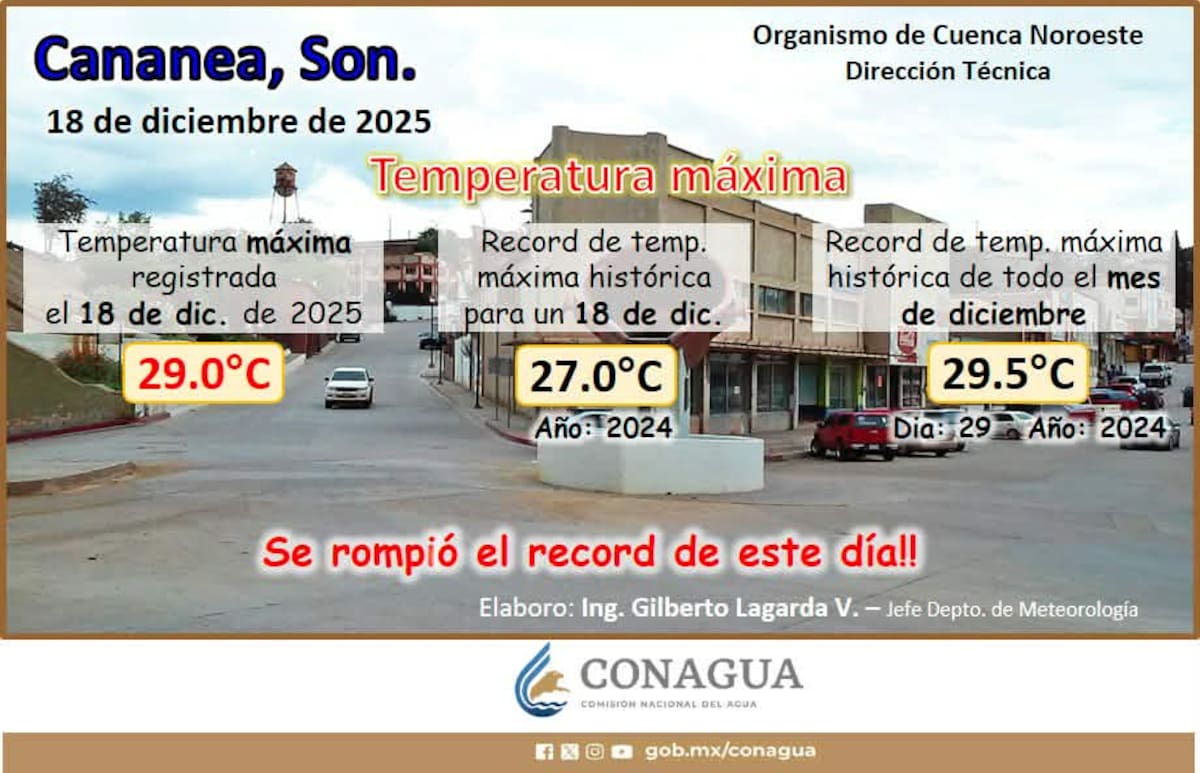 La Conagua Sonora detalla que la temperatura máxima alcanzada para un 18 de diciembre en Cananea había sido de 27ºC en 2024, y estuvo a punto a superarse también la temperatura máxima de todo el mes de diciembre, que es de 29.5ºC, alcanzado el 29 de diciembre del año pasado.