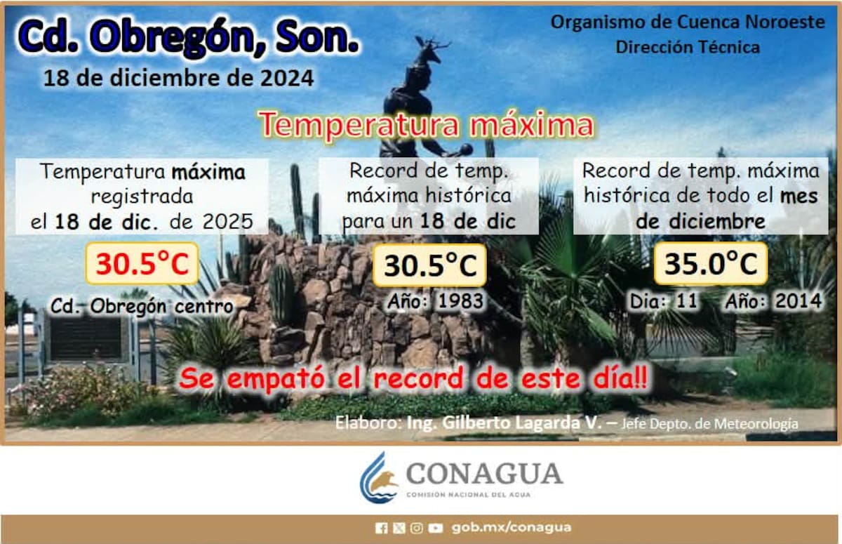 Ciudad Obregón no logró superar el récord de temperatura máxima, que fue de 30.5ºC, pero sí lo empató también el mismo jueves. La Conagua resalta en los datos que Ciudad Obregón no había llegado a estos valores un 18 de diciembre, desde el 2014.