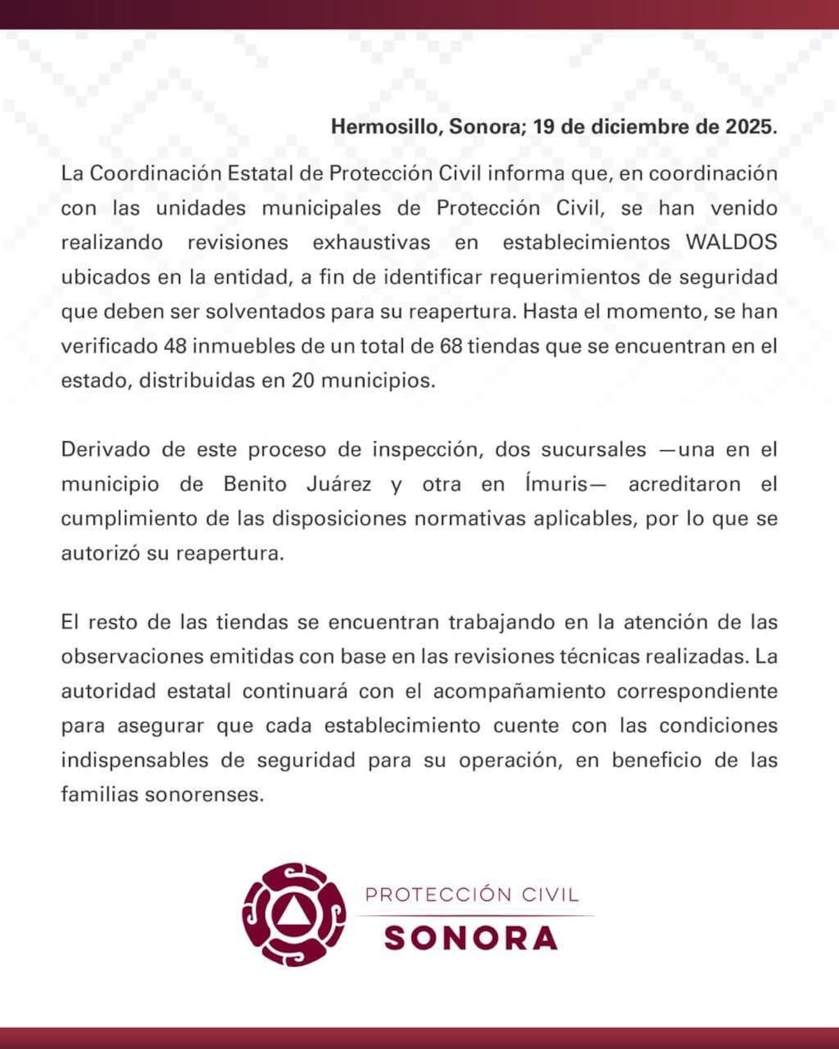 HERMOSILLO, Sonora.- La Coordinación Estatal de Protección Civil informó que, después de revisiones exhaustivas en las tiendas Waldos del estado, dos de ellas cumplen con la normativa necesaria, por lo que se autorizó su reapertura.