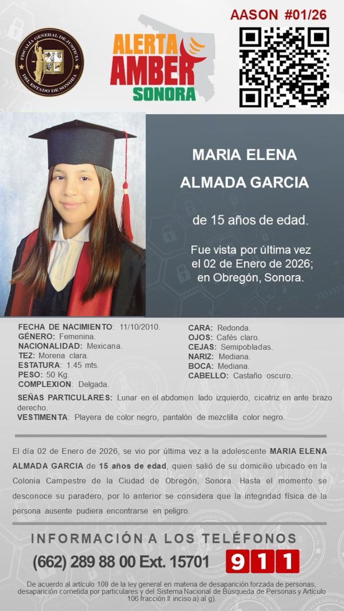 La Fiscalía General de Justicia del Estado de Sonora activó la Alerta Amber Sonora para la búsqueda y localización de la adolescente MARÍA ELENA ALMADA GARCÍA, de 15 años de edad, quien fue vista por última vez el 02 de enero de 2026 en Ciudad Obregón, Sonora.