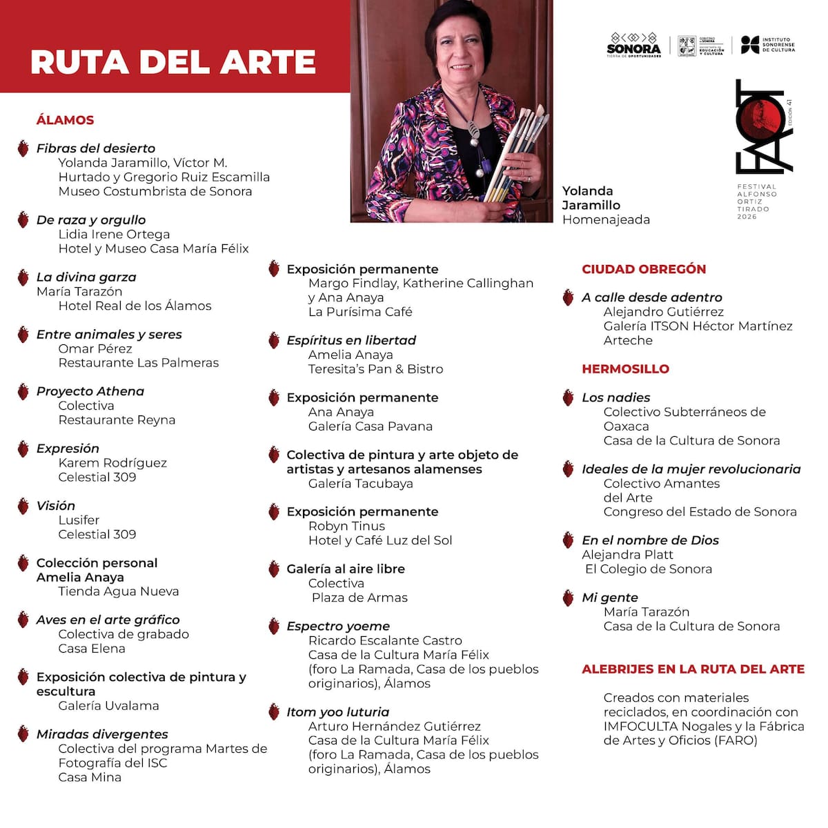 Aunque Álamos es la sede principal del Festival Alfonso Ortiz Tirado (FAOT), como parte de su programación cultural el evento extiende actividades artísticas a otros municipios del estado, a través de la Ruta del Arte, con exposiciones de pintura, fotografía, arte objeto y gráfica en espacios culturales y recintos públicos.