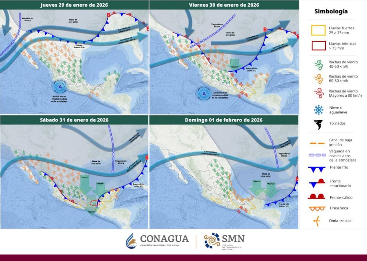 Un nuevo frente frío se aproximará al Noroeste del país para la mañana del viernes 30 de enero, lo que generará rachas de viento fuertes en el Norte y Noroeste de Sonora, así como un reforzamiento en el descenso de temperaturas. Este sistema mantiene probabilidad de lluvias de muy bajas a nulas.