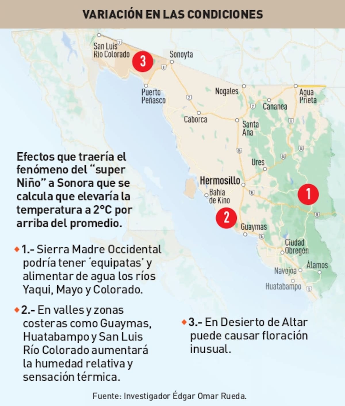 La intensidad que se espera de ‘El super Niño’ es porque las anomalías térmicas en el Pacifico Ecuatorial podrían superar los 2 grados centígrados por encima del promedio, y esto para Sonora significa un cambio drástico en el patrón de lluvias y temperaturas para el invierno 2026-2027”, explicó.