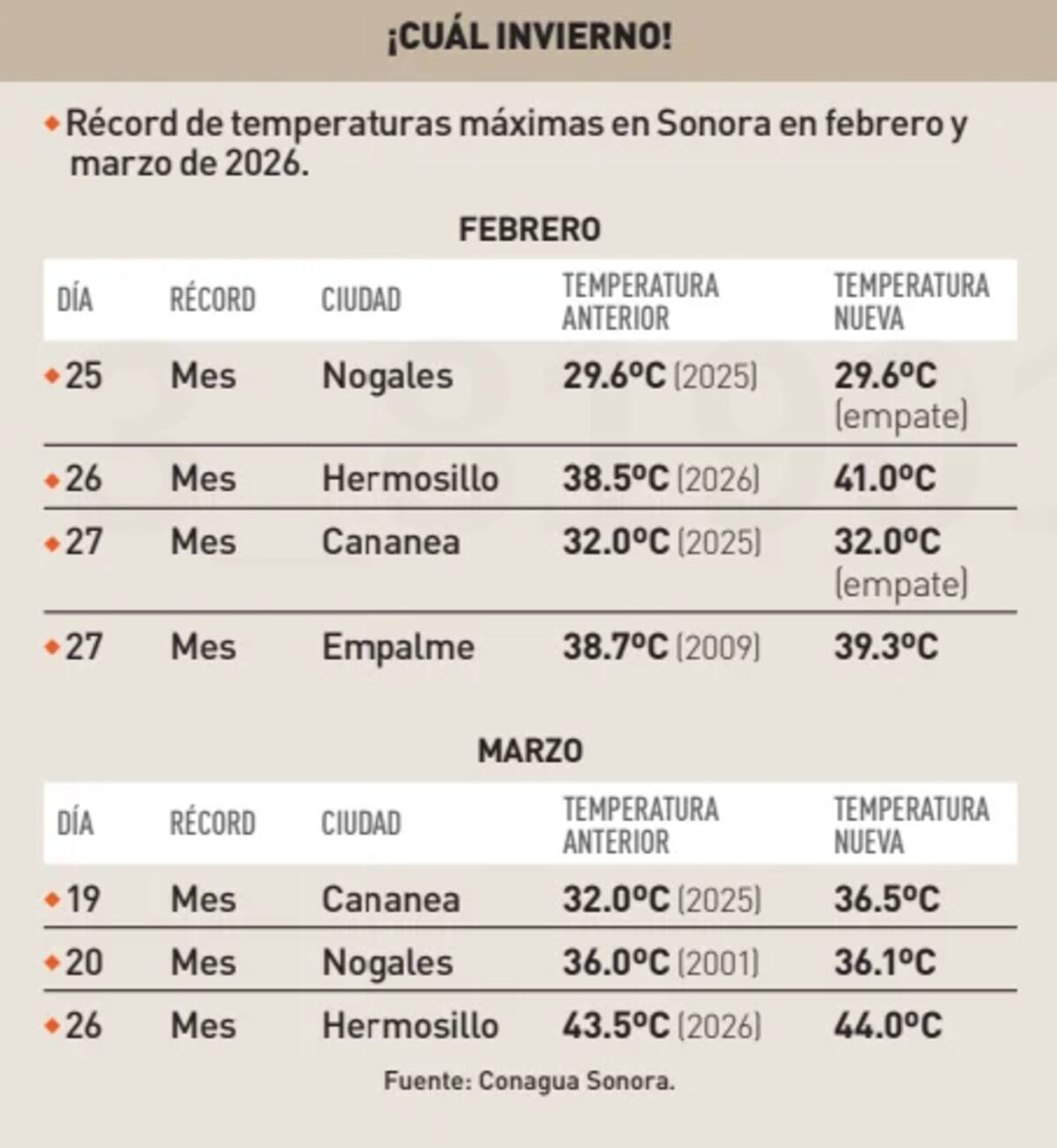 En lo que va del año, Sonora ya ha registrado temperaturas extremas. Febrero y marzo de 2026 han sido meses con múltiples récords, incluso con valores superiores a los 40°C en pleno invierno.