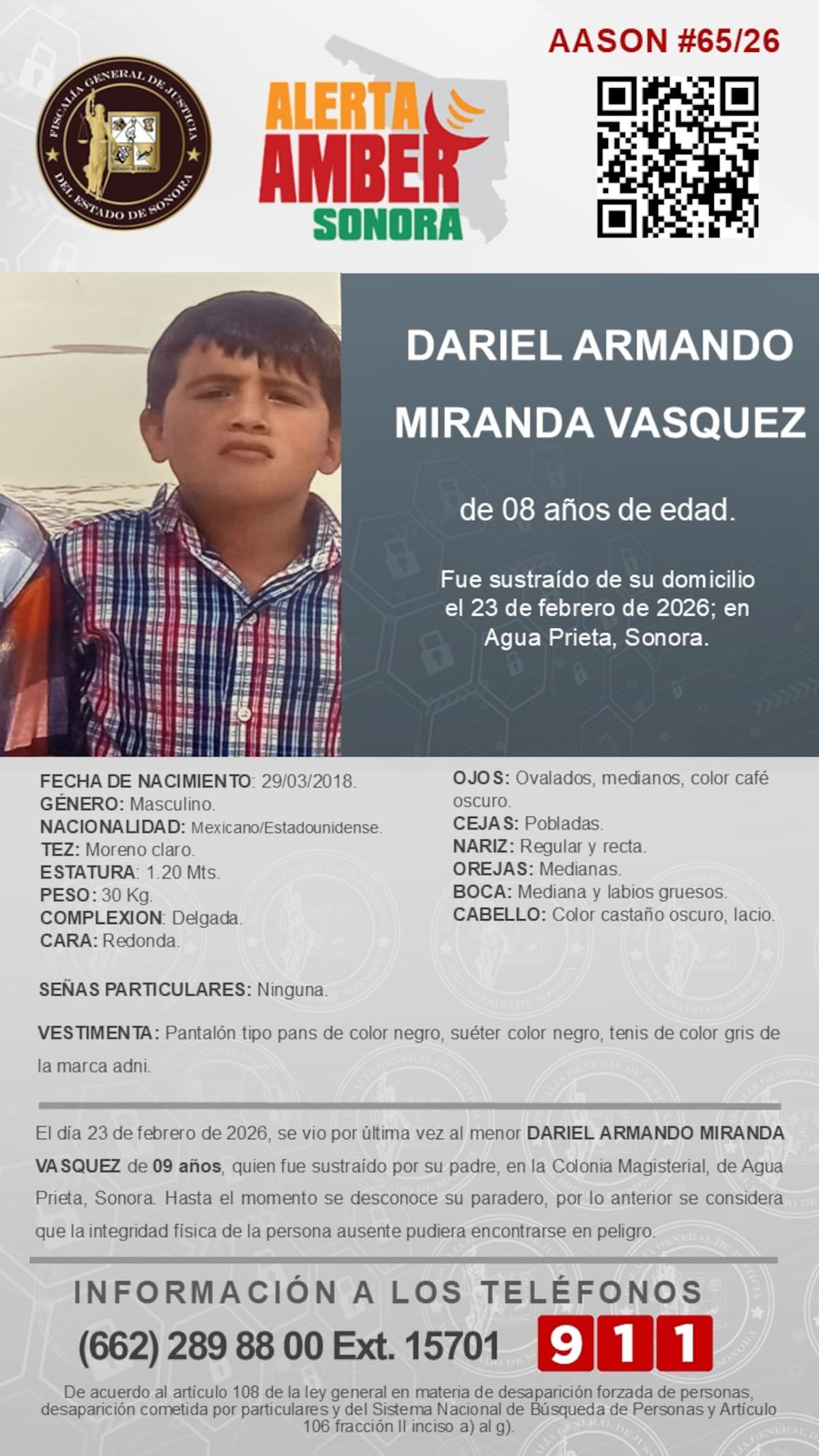 Dariel Armando Miranda Vásquez tiene 8 años. Nació el 29 de marzo de 2018. Mide 1.20 metros y pesa 30 kilos. También es de complexión delgada, tez morena clara y cara redonda. No presenta señas particulares.