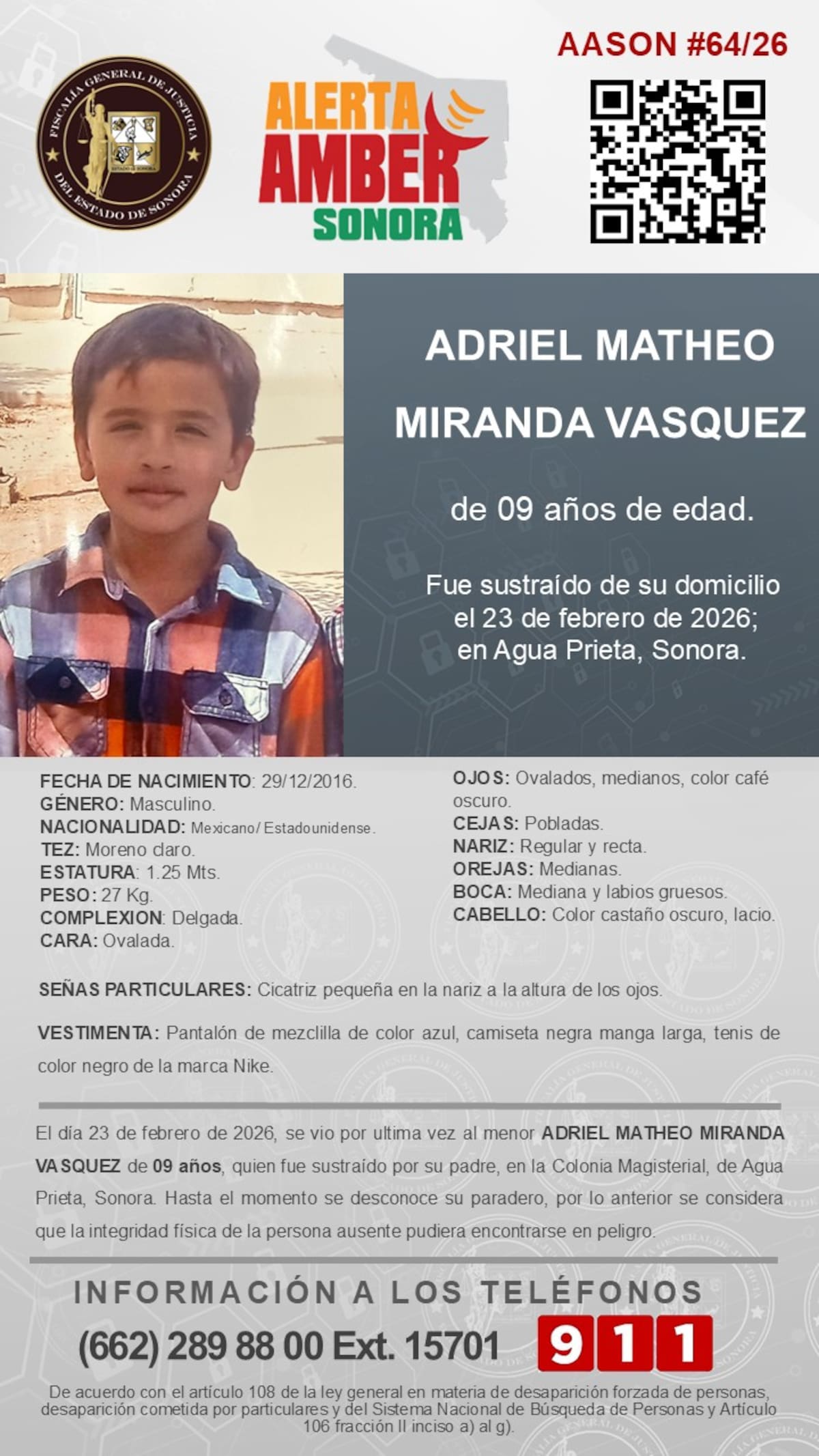 Adriel Matheo Miranda Vásquez tiene 9 años. Nació el 29 de diciembre de 2016. Mide 1.25 metros y pesa 27 kilos. Es de complexión delgada, tez morena clara y cara ovalada.