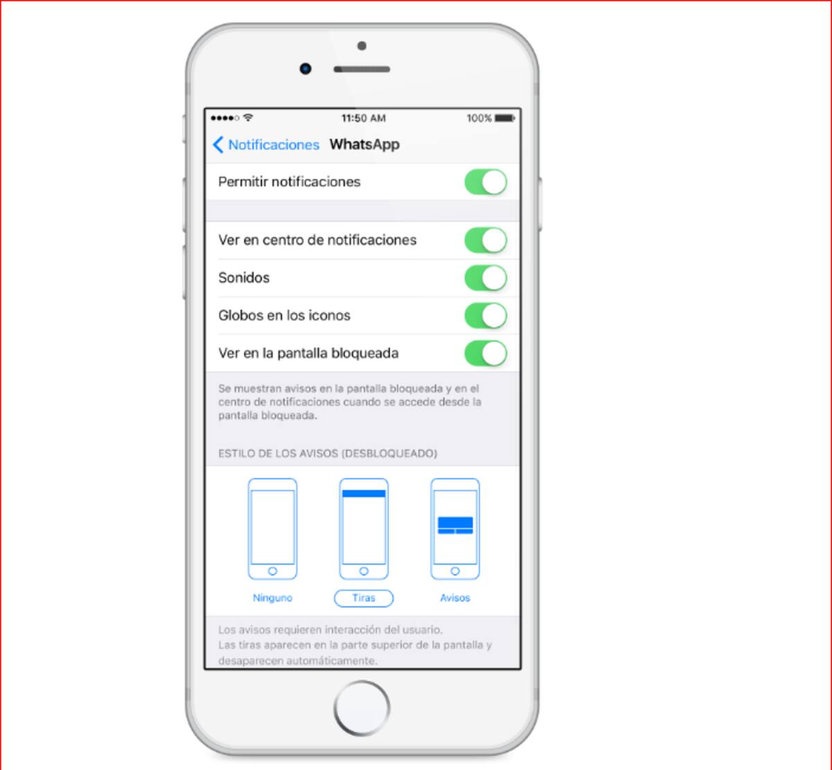 En tu iPhone, ve a Configuración > Notificaciones > WhatsApp. Configurar el estilo de las alertas (Tiras, Alertas, o Nada), globos y sonidos. Si quieres ver las notificaciones cuando la pantalla esté bloqueada, activa la opción Ver en la pantalla bloqueada.