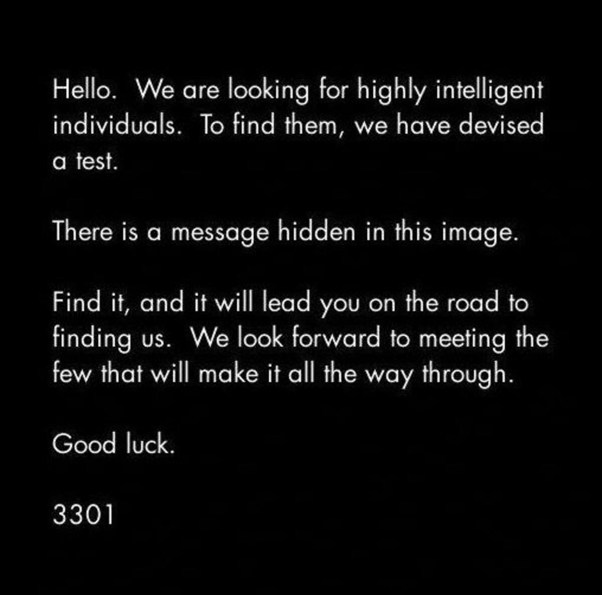 HERMOSILLO, Sonora.- “Hola. Estamos buscando individuos altamente inteligentes. Para encontrarlos hemos creado una prueba. Hay un mensaje oculto en esta imagen. Encuéntralo y te llevará por el camino hacia nosotros. Esperamos con ansias conocer a los pocos que llegarán al final del camino. Buena suerte. 3301”.