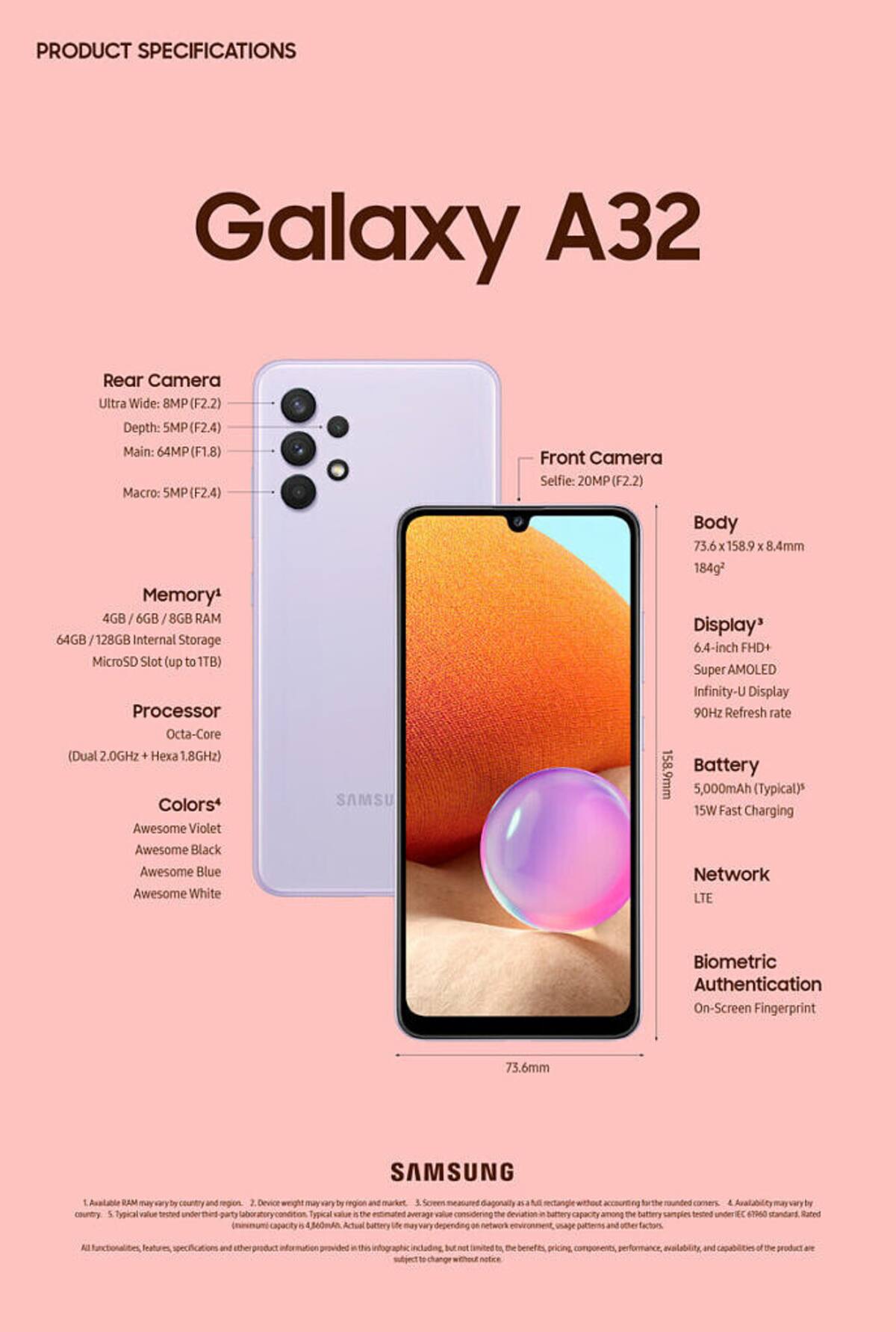 Samsung detalló que el Galaxy A32 integra pantalla SuperAMOLED de 6.4 pulgadas con resolución FullHD+, como su principal atractivo para un celular de gama media.