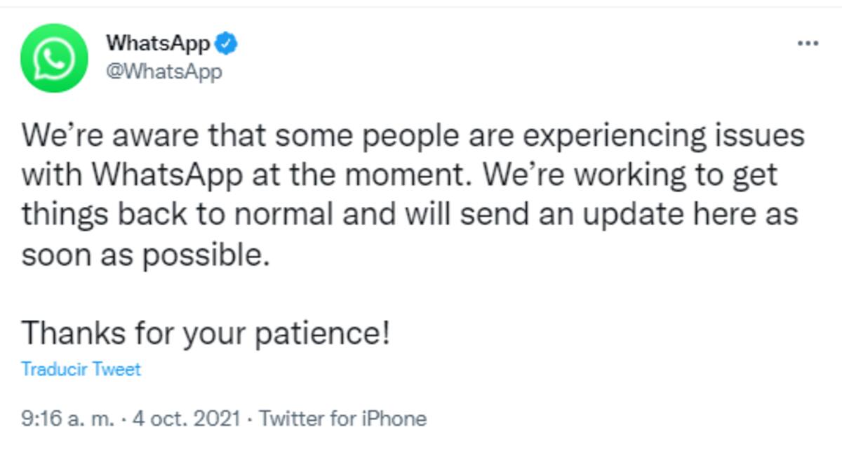 Estamos trabajando para que todo vuelva a la normalidad y enviaremos una actualización aquí lo antes posible”, informó la cuenta de Twitter de Whatsapp.