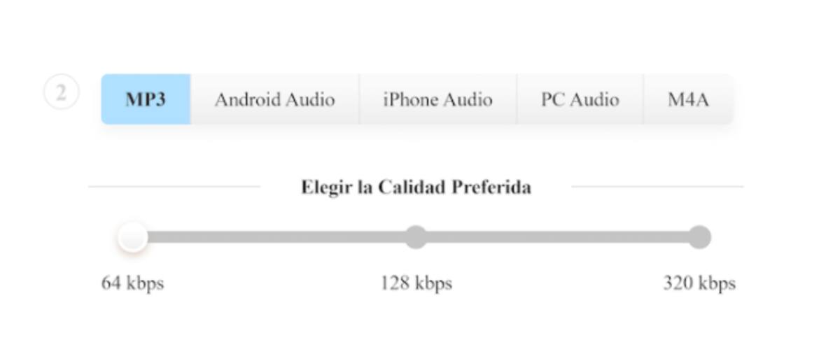 Esta es una de las principales características de la plataforma, puesto que es necesario que establezcas el formato a utilizar para el archivo de audio final (MP3, M4A) y la calidad para el mismo. Para esto último tendrás 3 opciones: 64 kbps, 128 kbps o 320 kbps, recordando que mientras mayor sea la calidad, más pesará el audio.