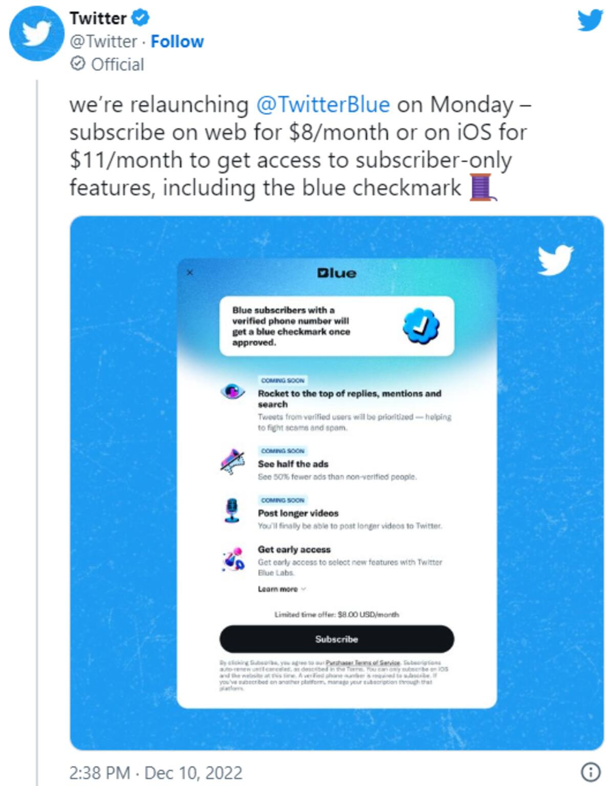 Estamos relanzando @TwitterBlue el lunes: suscríbanse en la web por 8 dólares al mes, o en iOS por 11 dólares al mes, para obtener acceso a funciones exclusivas para suscriptores, incluyendo la insignia azul de verificación", escribió la compañía en la plataforma.