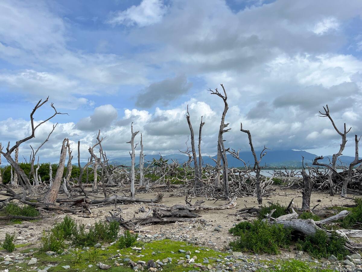 Alrededor hay unas pocas palmeras, algunos arbustos y rocas. Los árboles, impactados hace seis años por el huracán María, aún tienen escaso follaje.
