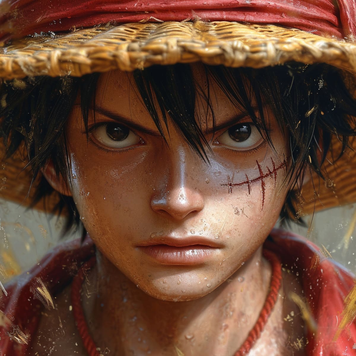 ‘A realistic portrait of Monkey D. Luffy from One Piece anime series with his trademark straw hat and red vest over a blue shirt and black pants. He has black hair with spiky blond bangs and dark brown eyes with long eyelashes. He has a scar under his left eye and a mole under his right eye. He is smiling widely and showing his teeth’.