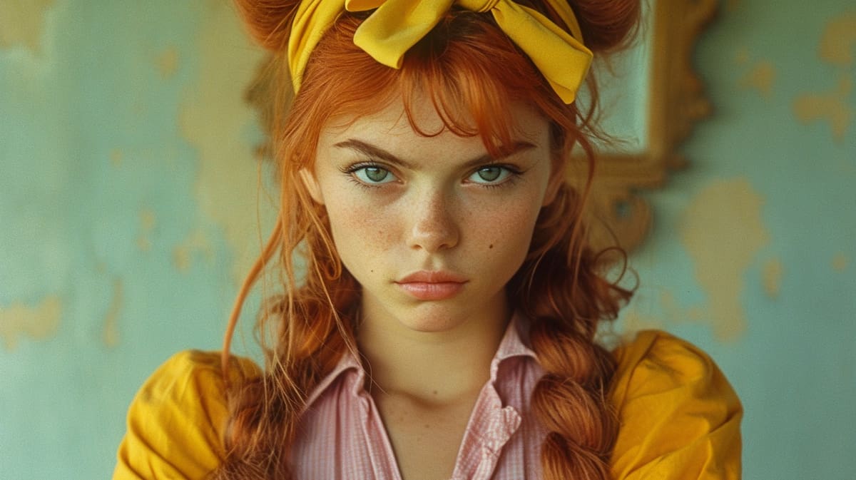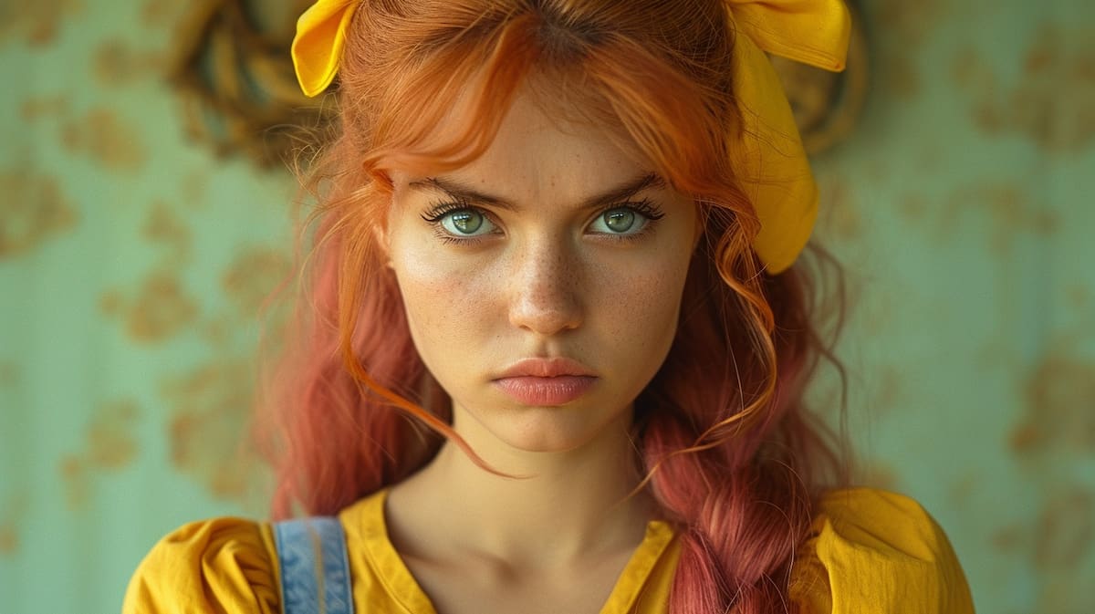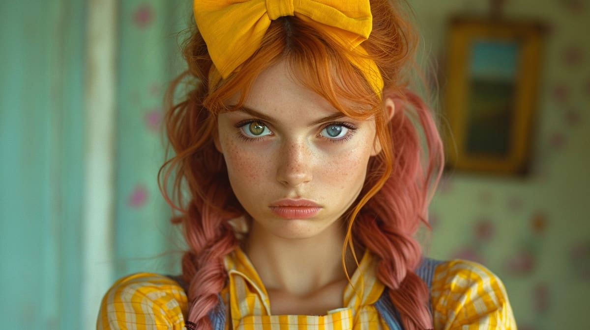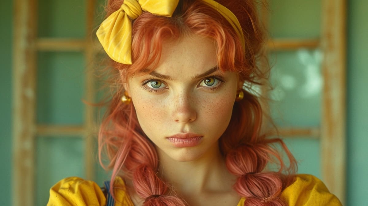Su distintivo cabello pelirrojo, adornado con un llamativo moño amarillo, aporta un toque de extravagancia a su imagen.