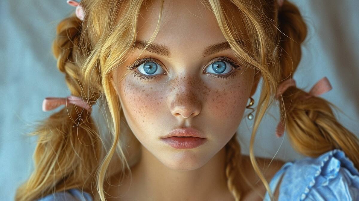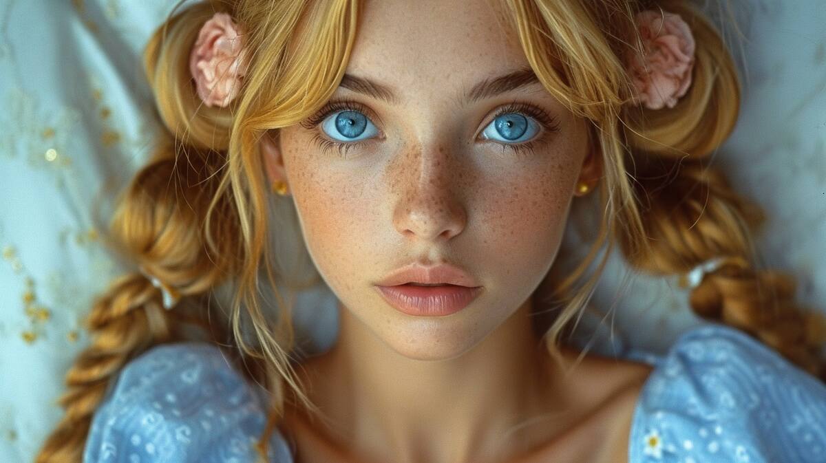 La representa con dos coletas que sujetan su exuberante melena rubia, luciendo un encantador vestido azul adornado con flores.
