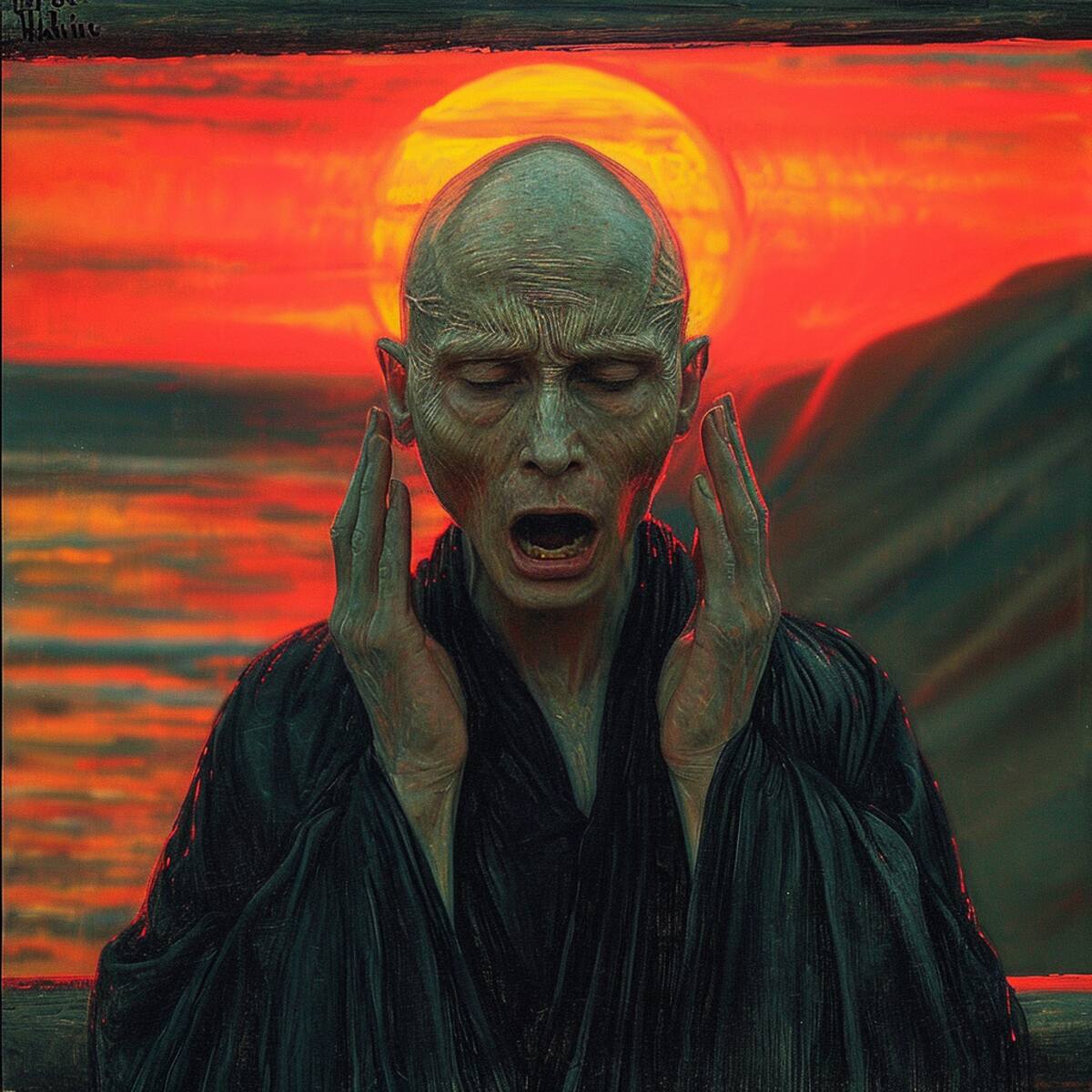 La imagen muestra a un hombre de mediana edad, sin cabello y sin barba, vestido con una capa negra. Su rostro refleja una profunda angustia y desesperación, con los ojos muy abiertos y la boca entreabierta. Sus manos se llevan a lacabeza, como si quisiera contener un dolor insoportable.