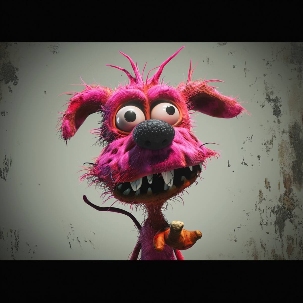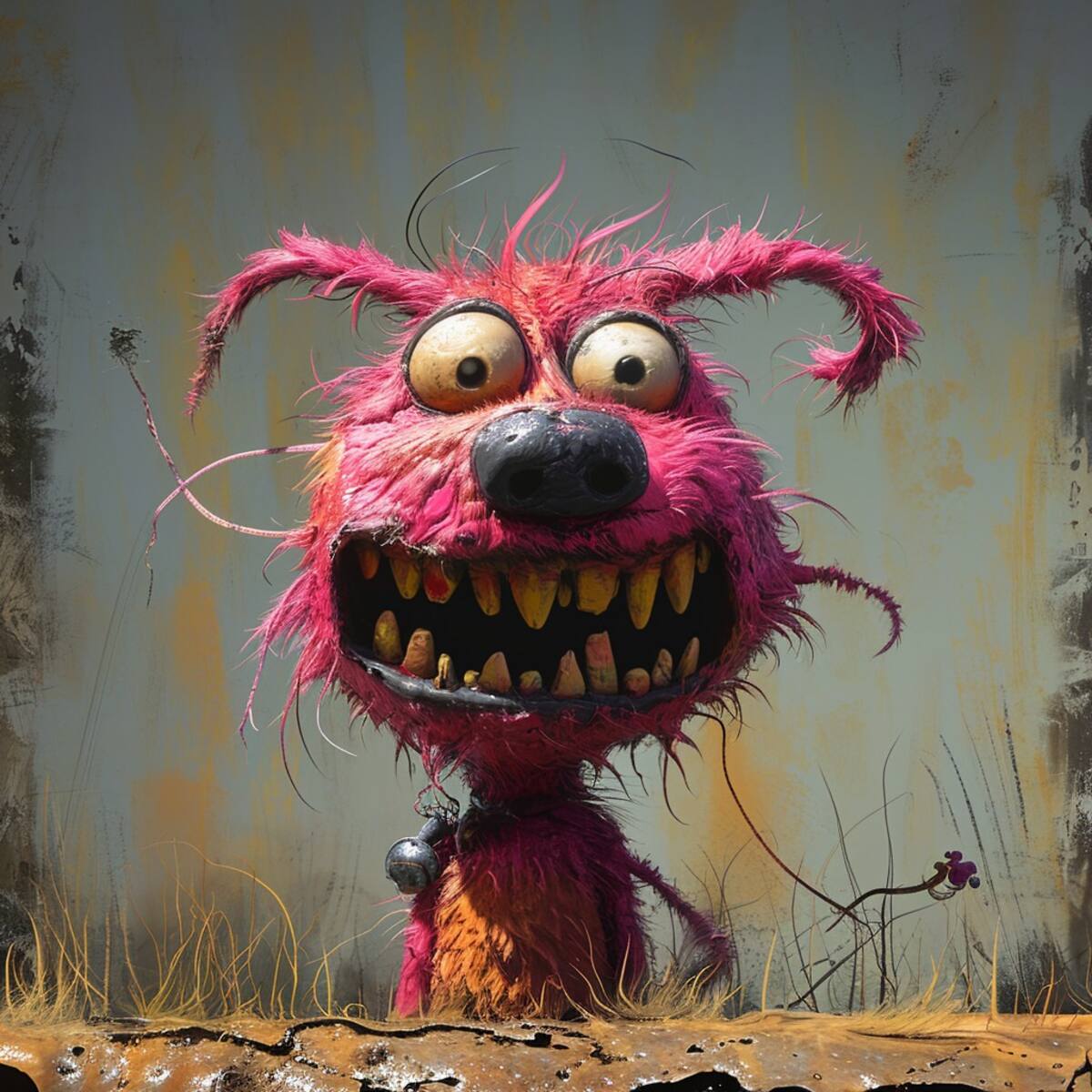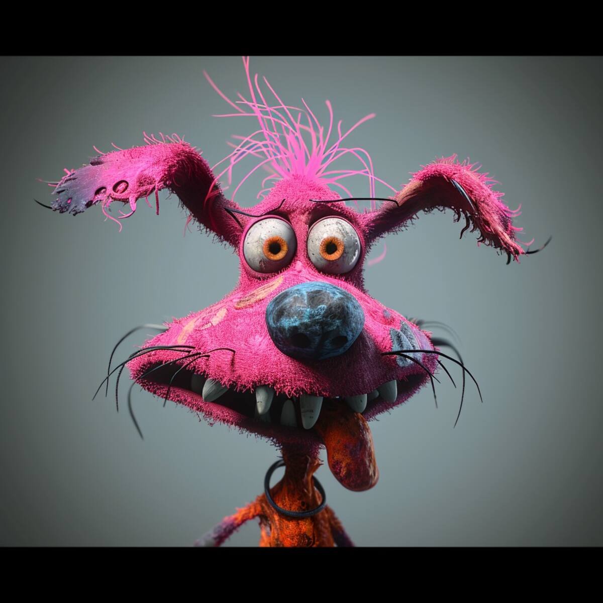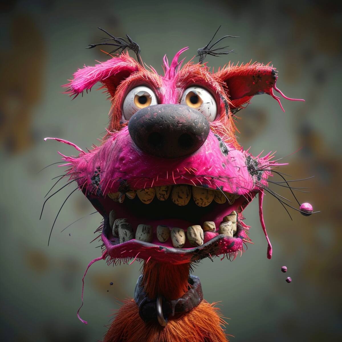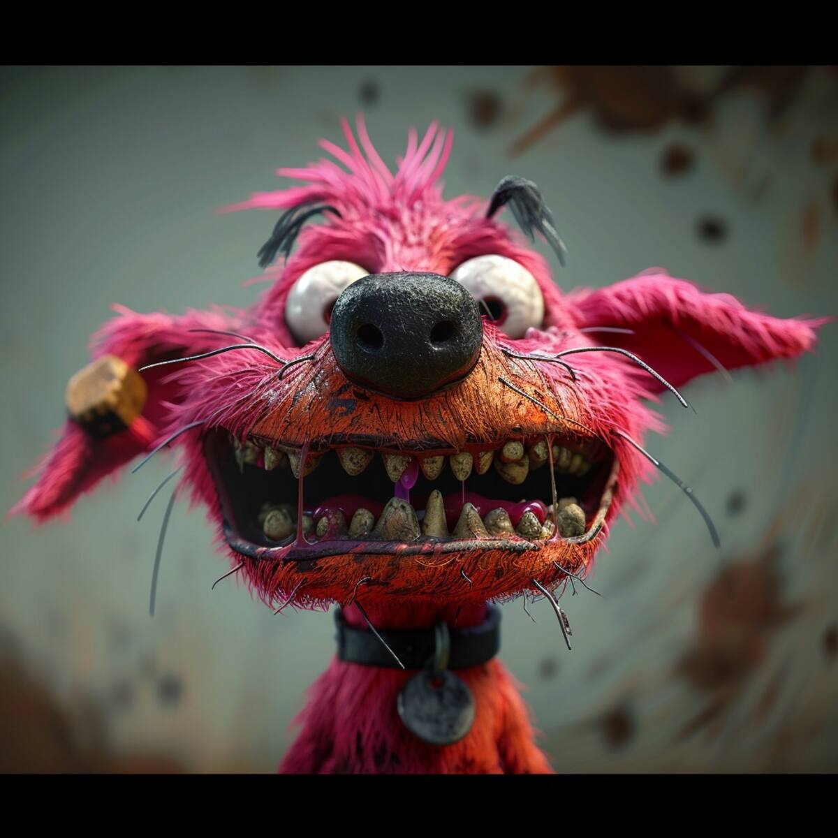 La inteligencia artificial ha plasmado a Coraje con una apariencia que refleja fielmente su personalidad temerosa y ansiosa, capturando su naturaleza valiente pero asustadiza.