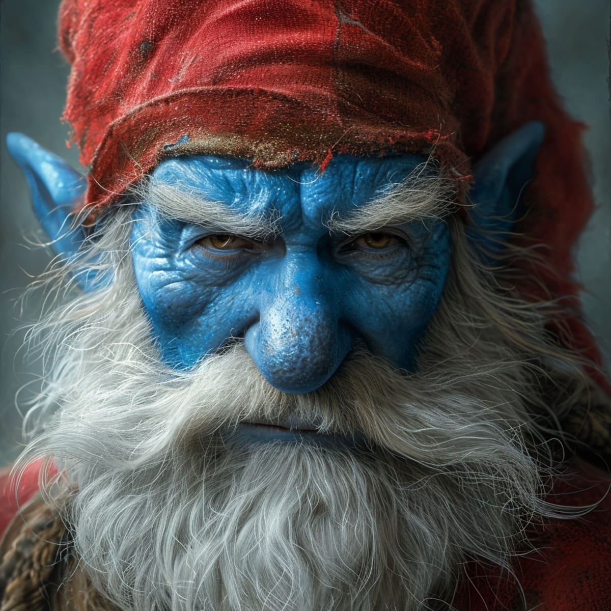 Pero, ¿cómo sería Papá Pitufo si fuera un ser humano real? Esta es la pregunta que le hicimos a Midjourney, una inteligencia artificial de tipo generativa, para crear una imagen realista de este personaje. El resultado es sorprendente: Papá Pitufo se convierte en un hombre mayor, de cabello y barba canosos y piel azul. Conserva su característico gorro rojo. Su expresión es serena, como corresponde a su personalidad.