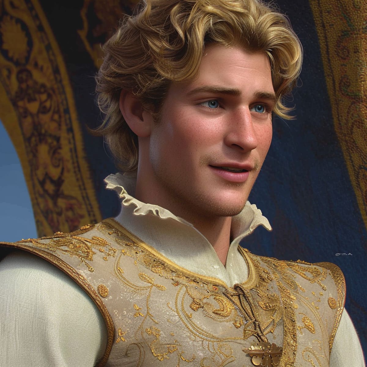 El Príncipe Encantador tiene un aspecto elegante y atractivo, con un estilo que recuerda al de los personajes de Disney. Su expresión facial transmite confianza y simpatía, y su pose es dinámica y natural.