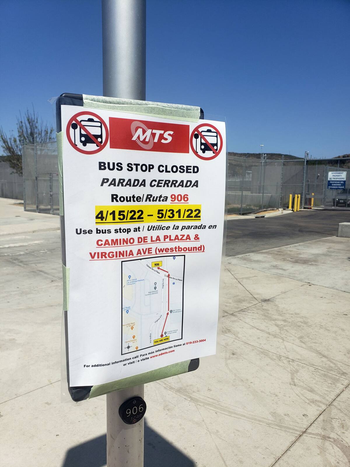El Servicio de Tránsito Metropolitano (MTS) informó que la ruta de camiones 906 que corre junto al PedWest y Plaza Las Américas actualmente está suspendida debido a trabajos de construcción en San Ysidro, ésta será restablecida el 1 de junio.