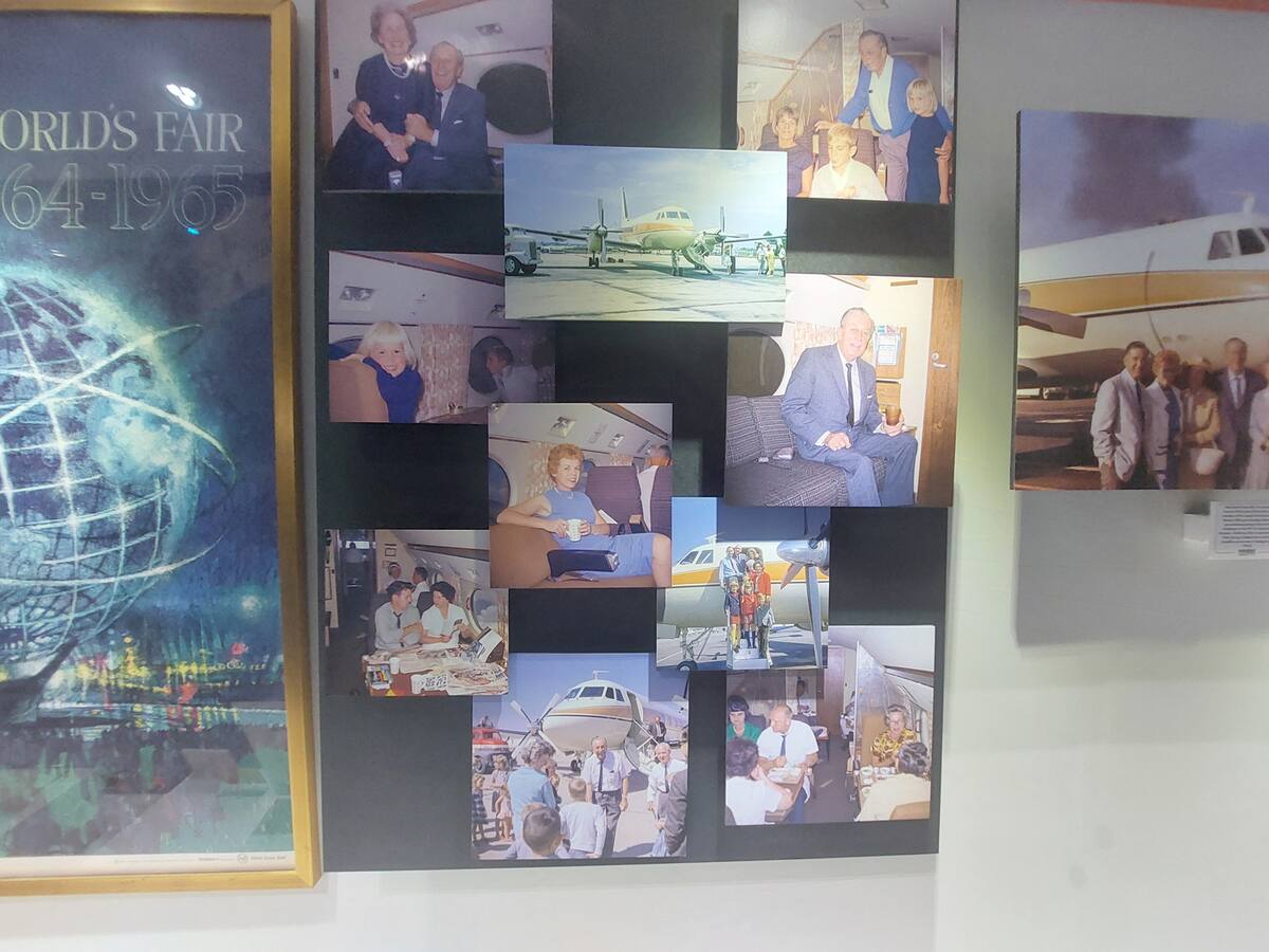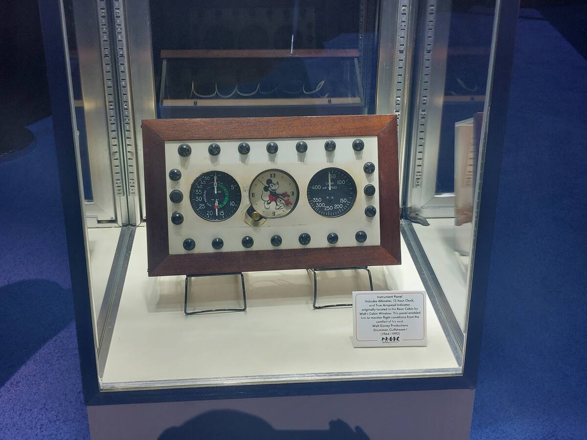 También se puede apreciar un teléfono que le dio a Walt una línea directa de comunicación con el piloto en la cabina, una bolsa de viaje con una imagen de Mickey Mouse sentado en la cola del icónico avión; y más.