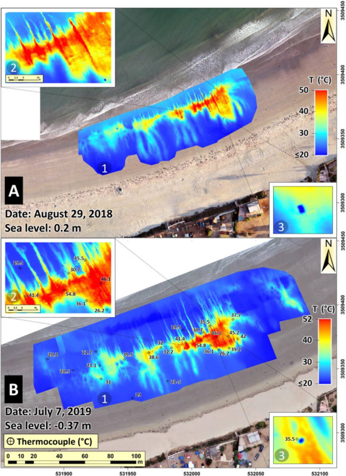 Desde una perspectiva interdisciplinaria, la aplicación de tecnología moderna de exploración, procesamiento de datos, medición de temperaturas, así como la estimación de la descarga hídrica en la costa y su relación con la marea, fue posible describir las características peculiares de la anomalía térmica de esta playa, que registra 52°C en la superficie y alcanza hasta 93°C a una profundidad de 20 centímetros en la arena, una característica extraordinaria.