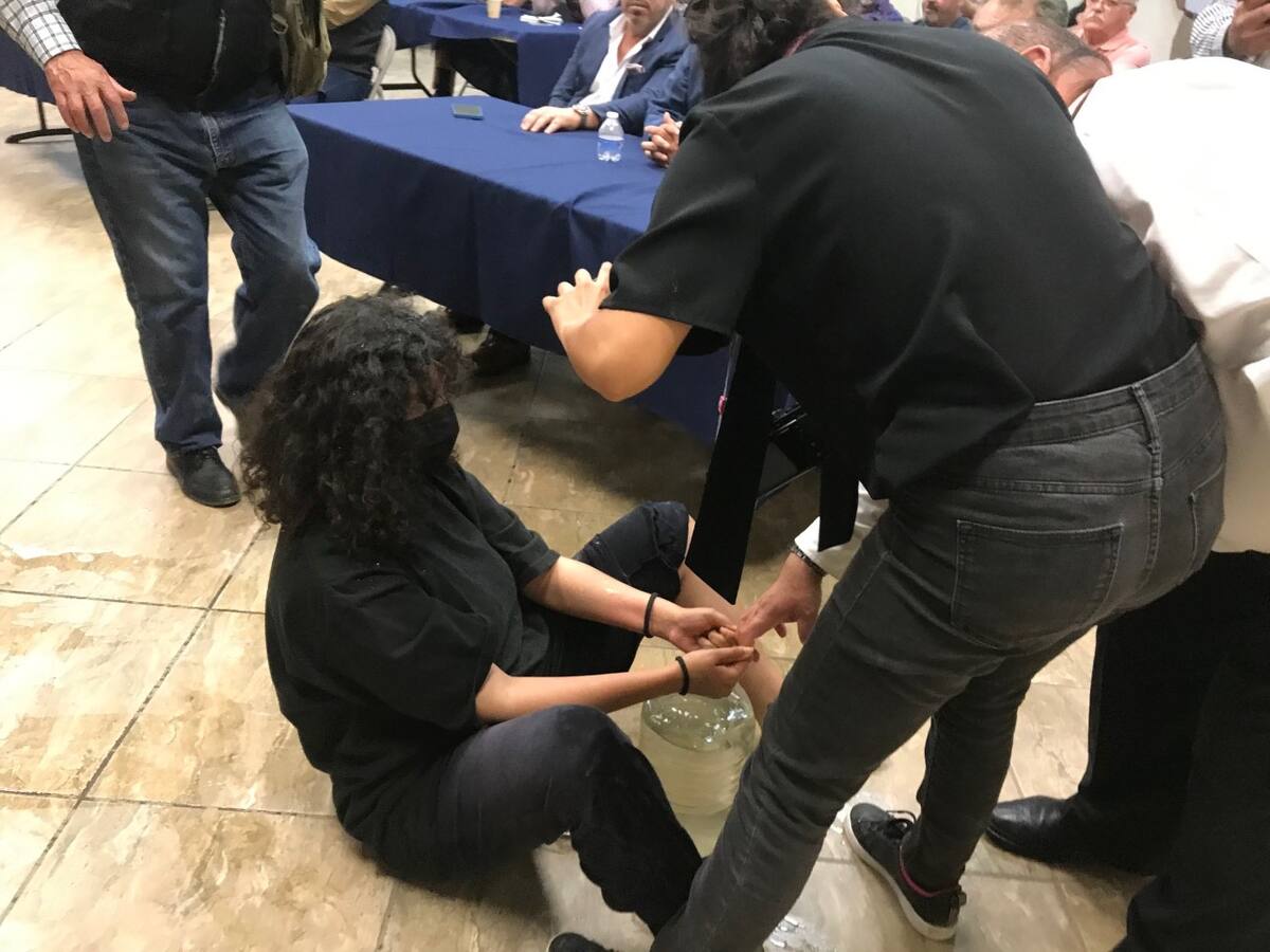 A mitad de la sesión una joven irrumpió en el lugar con envase lleno de agua sucia que arrojó en su cuerpo y posteriormente arrojó un poco a los funcionaros de la Cespe y al Secretario para el Manejo, Saneamiento y Protección del Agua, Francisco Bernal Rodríguez.