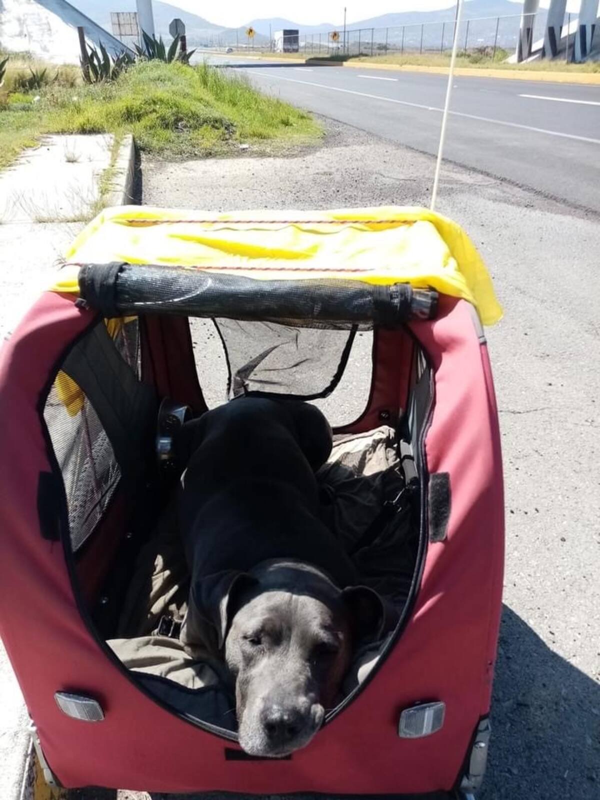 Comentó que la prioridad de su viaje es Teo, ya que lo tiene desde cachorro y en todo momento está al pendiente de que tenga alimento, agua y sombra, por lo que compró un carrito especial para que vaya a su lado durante todo el viaje y sea cómodo.