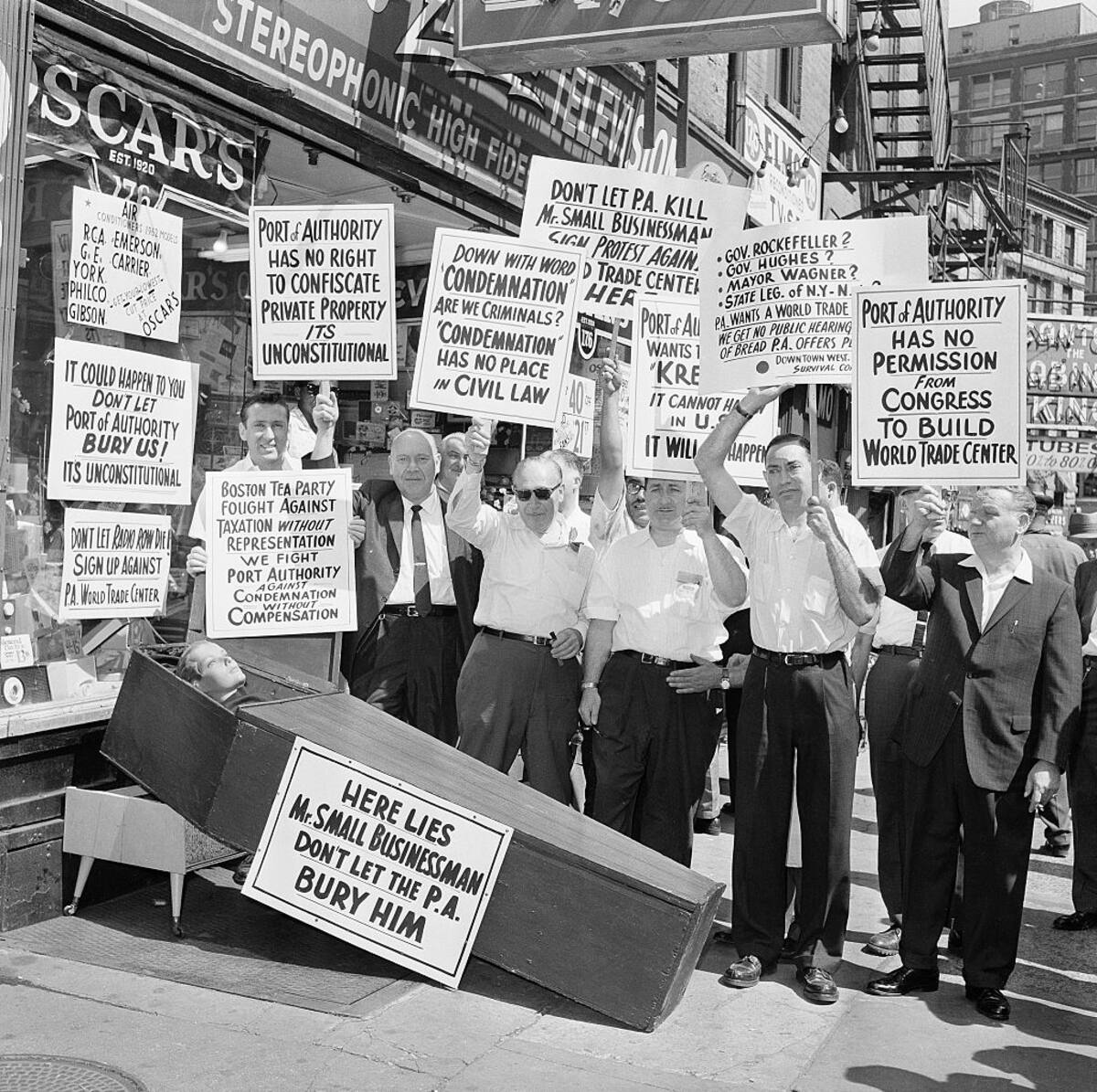 Cargando un ataúd negro por la ciudad con una etiqueta que rezaba "pequeño empresario", los comerciantes de Radio Row organizaron un simulacro de funeral en julio de 1962 para dar visibilidad a su causa.