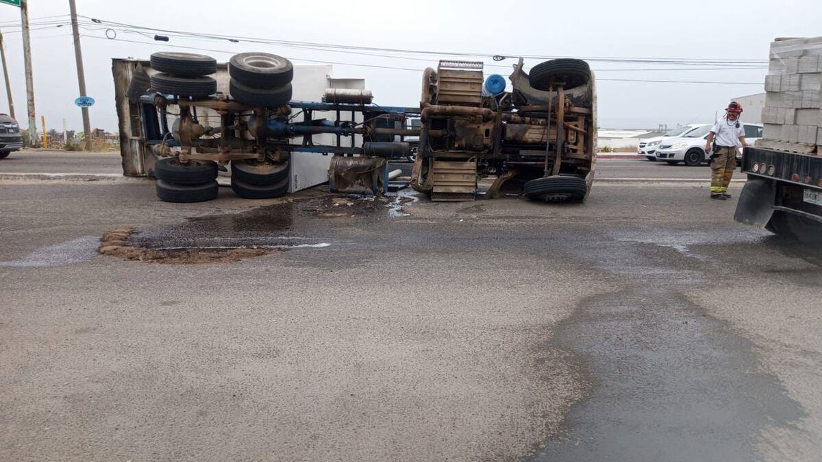 Rosarito, BC.- Un camión cargado de asfalto, se volcó la mañana de este sábado en el cruce del Corredor 2000 y el bulevar Popotla, en Rosarito, el chofer resultó con lesiones leves, y al parecer una falla en los frenos fue la causa del accidente.