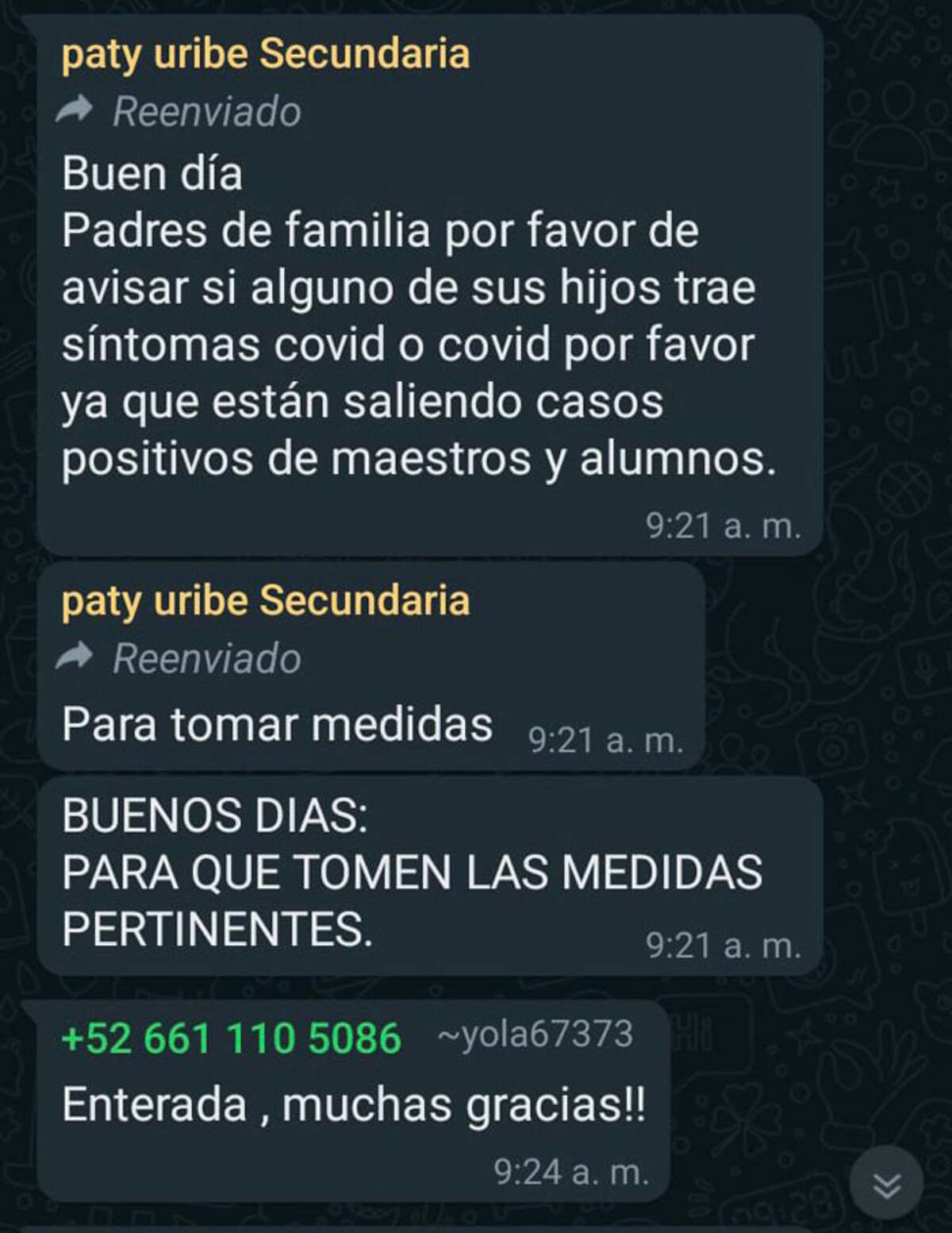 A través de un grupo de WhatsApp del plantel, los padres de familia fueron informados sobre la causa de la suspensión de clases indicando que si alguno de sus hijos presentaba síntomas, lo reportaran ya que estaban saliendo casos positivos de maestros y alumnos.