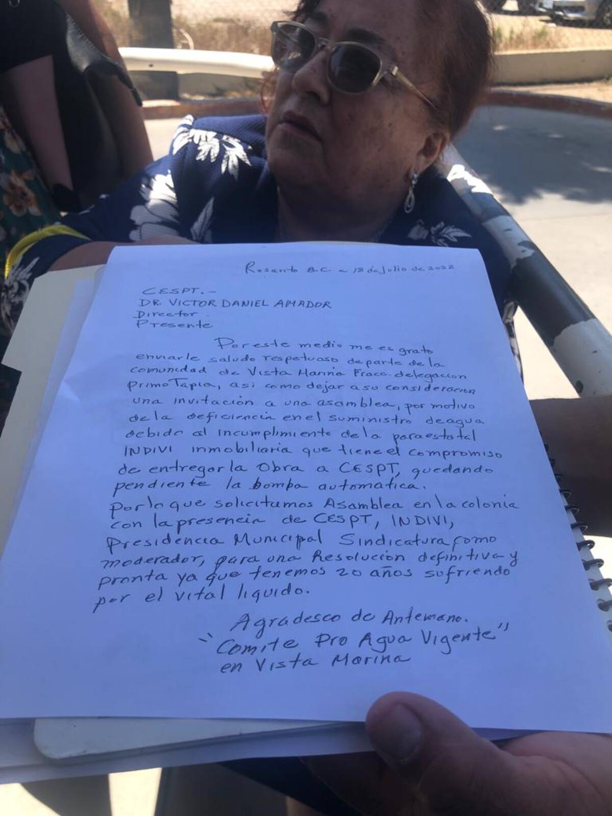 Linda Villacorta, residente del lugar, acudió a las oficinas de la Cespt en Rosarito y junto a una decena de sus vecinos protestaron a las afueras de la dependencia, exigiendo la realización de una asamblea en la colonia a la que acudan no sólo representantes de la Cespt sino también del Indivi, la presidencia municipal y el síndico, para que se dé una solución definitiva a este problema.