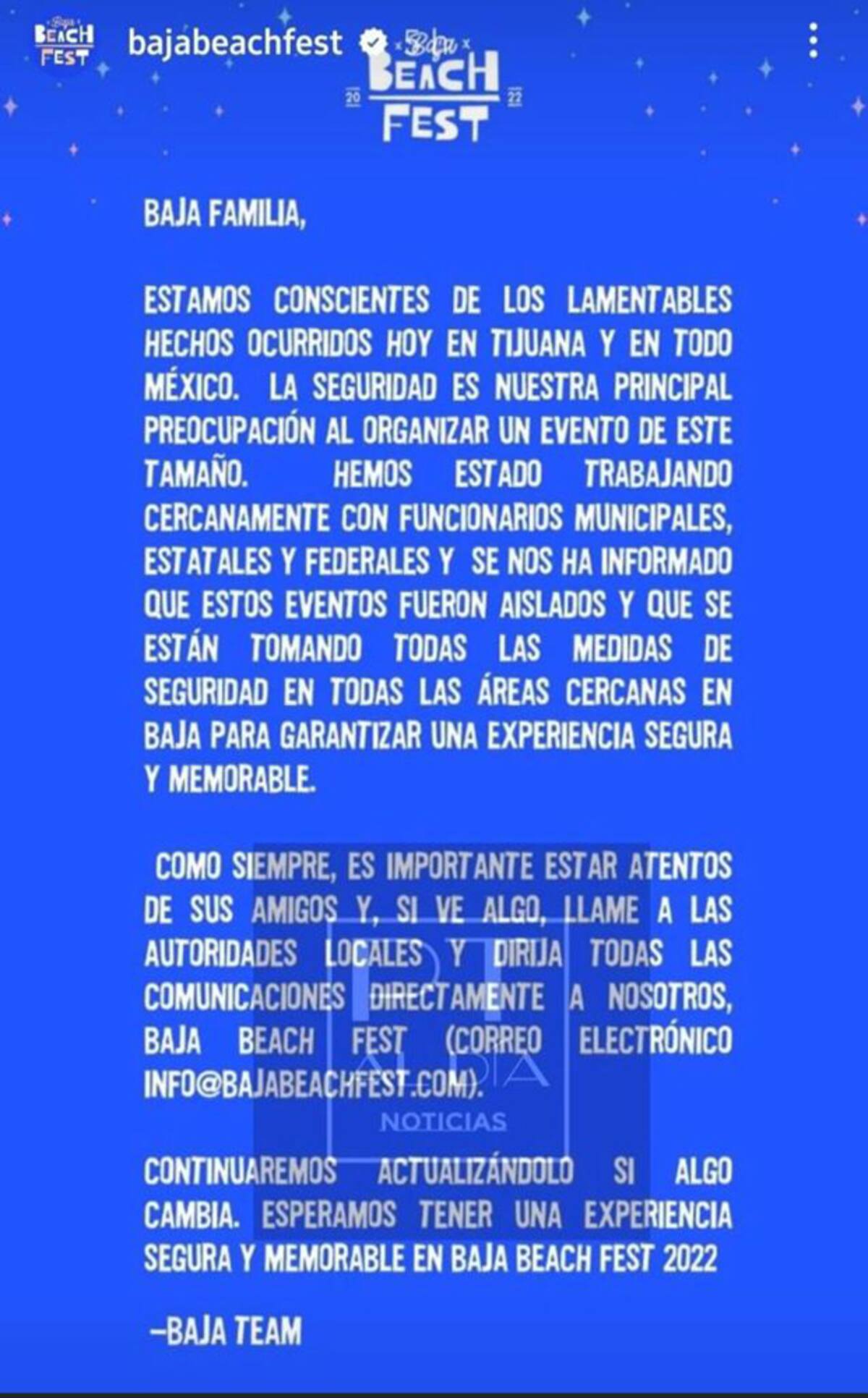 “Estamos conscientes de los lamentables hechos ocurridos hoy en Tijuana y todo México. La seguridad es nuestra principal preocupación al organizar un evento de este tamaño. Hemos estado trabajando cercanamente con funcionarios municipales, estatales y federales y se nos ha informado que estos eventos fueron aislados y que se están tomando todas las medidas de seguridad en todas las áreas cercanas en Baja para garantizar una experiencia segura y memorable.